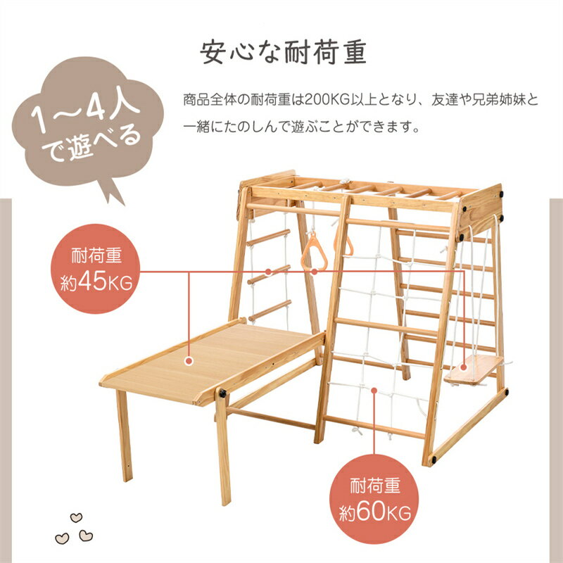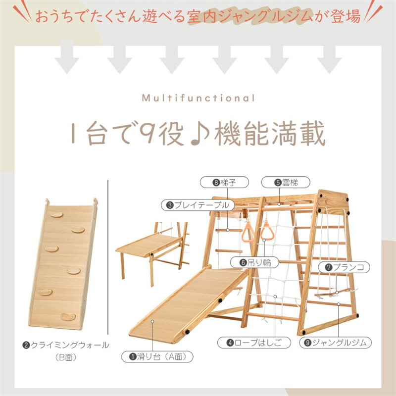 商品情報 商品詳細 POINT 1.【1台で9役♪】 ♪機能満載 1.滑り台(A面) 2.クライミングウォール(B面) 3.プレイテーブル 4.ロープはしご 5.雲梯 6.吊り輪 7.ブランコ 8.梯子 9.ジャングルジム ▼ ♪DETAIL.01 ▼ ツルツル滑り台(A面) 両面使える多機能滑り台♪ 厚みのある板材で作られたため、安定感がある けがをしないように、安心安全の角取り加工 ※素材は同じですが、実物の木目が横になるので、予めご了承ください。 DETAIL.02 ▼ 反面クライミングウォール(B面) ロックがしっかり固定されているので、遊ぶ時ぐらつきにくい。 ♪DETAIL.03 ▼ プレイテーブル サイドに脚➡アジャストを緩めて調整➡完成 滑り台の両サイドに足がついており、ツルツルの面を上に、足を立てるように回したら、広々としたプレイテーブルに変身! DETAIL.04 ▼ ロープ梯子 はしごを上ることで、お子様の筋力、柔軟性と体のバランスが鍛えられる DETAIL.05 ▼ 雲梯 ぶら下がることで、腕力がついたり、背筋や下半身が伸びたりする 下から上の場合、足の筋力、ジャンプ力と瞬発力がアップするので全身が鍛えられる DETAIL.06 ▼ 吊り輪 背伸びを助けてくれる! 耐久性の高いプラスチックを使用したため、長くお使えいただける 滑り防止にもなる柔らかいゴムで包んでいるので、安心安全にご使用可能 DETAIL.07 ▼ ブランコ 安全面を考慮し、最高の強度と耐久力・耐候性・耐水性も抜群のナイロンロープを使用している ロープを結ぶだけで簡単に設置できる DETAIL.08 ▼ 梯子 登ったり降りたりして 全身運動 DETAIL.09 ▼ ジャングルジム 初めてのお子様にも遊びやすい大きさで 全身を使って登ったり、降りたり、下ったりして遊ぶことで、筋力・バランス感覚・柔軟性が養われる POINT 2.【折りたたみ収納 】必要な時だけ、サッと広げで遊ぶ 普段は折り畳んで、省スペースに収納可能 おうちの空間を最大限に活用 来客時の邪魔にならない POINT 3.【天然木素材を使用】1.欅棒(丸い手すり)と松木のプレームで仕上げたため、非常に頑丈で変形しにくい! 2.木材は安心の無着色 3.木目が綺麗でおうちのインテリアにも馴染みやすい POINT 4.【お子様が安全に遊べるように、細かいところまで配慮】 1.安心安全な塗料 塗装には安全性テストに合格した透明ワニスを採用し、健康に悪い影響がないことに心掛けています。 2.全体丸角加工 遊んでるうちにけがをしないように、角をすべて丸く加工しており、また、表面もツルツルに磨いているので安全性を最大限高めました。 3.表面をツルツルに 木材を何度も磨き重ねてツルツルに仕上げたので、感触がよくて、ザラザラでけがをする心配もない 耐荷重について 商品の耐荷重:50kg 吊り輪の耐荷重:35kg ブランコの耐荷重:35kg 丸い棒の耐荷重:35kg プレイテーブルはおもちゃなどだけ置けます。予めご了承ください。 備考 ※お客様都合によるご注文のキャンセル及び返品についてa ご注文確定後、すぐにご発送の手配を開始いたします。【発送準備前】:ご注文キャンセル・変更可能でございます。【発送準備開始後】:ご注文キャンセル・変更・返品・交換不可でございます。 ※商品について何かご質問がありましたら、お気軽にご連絡ください。この商品はお買い上げ日から一年間安心保証があります。ご安心下さいませ。 ※運送途中に損害をもたらす可能性があり、ご心配なくお気軽に弊社とご連絡ください。 ※大型商品ですので、開梱後のお客様都合による、ご返品を承る事が出来かねます。万が一、搬入ができなかったなどの理由による、ご返品の際は往復の送料とお手数料をお客様にご負担いただきます。商品梱包サイズをよくお確かめの上ご購入下さいませ。) ※撮影の為、画質等の関係上、色などが実際の商品と若干違ってしまうこともあるかもしれませんが、ご理解のほどご購入ください。予めご了承ください。 ※更新のタイミングによっては実在庫に相違が出る場合がございます。万が一在庫切れや入荷待ちとなる場合は別途メールにてご連絡いたします。