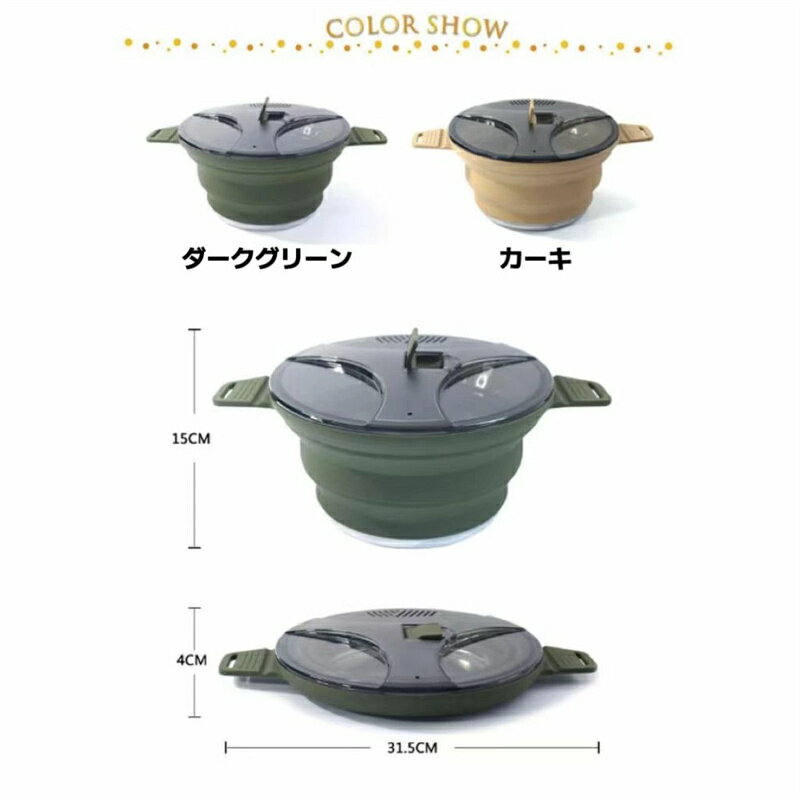 商品情報 商品詳細 サイズ:2500ml 素材:シリコン/ステンレス 色:ダークグリーン/カーキ 折りたたみできるシリコン製のキャンプ用鍋です。 片手で上から押すだけで簡単にコンパクトに折りたため、厚さわずかcm重さ490gしかありませんから、楽に持ち運びできます。 底がステンレス製なので直火で使え、キャンプやアウトドアにも便利です。 湯切り穴が空いた半透明の蓋付き。 備考 ★撮影の為、画質等の関係上、色などが実際の商品と若干違ってしまうこともあるかもしれませんがご理解のほどご購入ください。予めご了承ください。 ★更新のタイミングによっては実在庫に相違が出る場合がございます。万が一在庫切れや入荷待ちとなる場合は別途メールにてご連絡いたします。