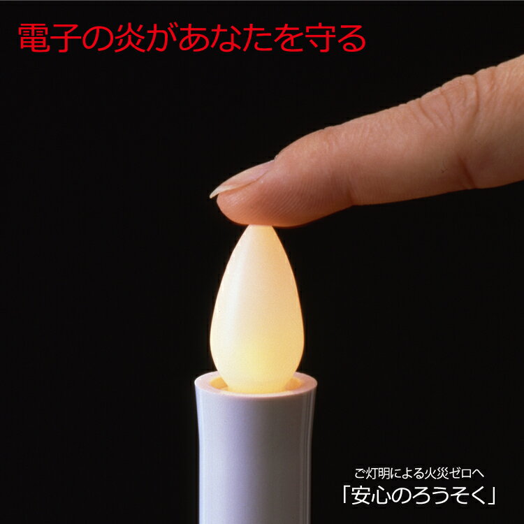 住環境や核家族化、高齢化社会などにより、お仏壇の管理は大変になっています。ろうそくやお線香が原因の火事も決して少なくありません。安心してお仏壇を管理するために必要な安心の仏具が必要な時代となってきました。 安心のろうそくは、炎部分はLEDのため、倒れても安全です。突然の地震などの災害時にも安心です。外出先でろうそくの火の始末が心配になった・・・などの不安もこれで解消します。 電池式なんで、ライター・マッチはもちろん不要。配線も不要です。炎部分をポンと押すだけの簡単操作なので、ご高齢の方でも手軽にご利用頂けます。こちらは、燭台なしタイプ。お手持ちの燭台に差し込むだけでOKです。 商品名 : 安心のろうそく・小サイズ[2本入]燭台なしタイプ 材質 : 本体:ABS樹脂 電池ケース:ポリプロピレン 炎:PE樹脂 本体サイズ(約) : 直径21mm×高さ136mm(1本あたり) 重量(約) : 19g(1本あたり) 使用光源 : 黄色LED×1(1本あたり) 使用電池 : 単5形乾電池×2個(点灯確認用電池付属)(1本あたり) 使用時間(約) : 60時間(1日15分使用で約7ヶ月) 生産国 : 日本製 JANコード : 4962644 929856ろうそくやお線香が倒れ、火災となるケースが後を絶ちません。 ローソクの炎が近くの燃えやすい物に引火したり、 地震などの予期せぬ事が起こって倒れたりなどのケースもあります。 住環境の変化から、 お仏壇を安置するための特別な部屋「仏間」を設ける事が少なくなり、 リビングなどに安置するように変わってきています。 お仏壇もよりコンパクトなものに変わり、 省スペースで安置することが可能となりました。 マンションなどの集合住宅も増えました。 そこで、心配なのが「火災」です。今ある場所は安全ですか? 何世代も同居する大家族世帯から、次第に核家族化が進みました。 お仏壇を見守るということも手薄になります。 共働きの方もいるでしょう。 老夫婦でお住まいの方もいるでしょう。 そこで、心配なのが「火災」です。火の始末は大丈夫ですか? そこで必要なのが、火を使わない安心のローソク。 黄色のLEDを使用することで、 本物のローソクの炎に近い温かみのある色合いを実現しました。 安心のろうそくをご利用されているお客様より、 「違和感のないちょうどいい明るさ」とコメント頂きました。 電子の炎なのでゆらめきこそありませんが、 温かみのある明るさです。 また、LED球なので、球切れの心配がなく経済的です。 穴付き底なので、お手持ちの燭台に差し込めばOKです。 炎部分は、LEDなので倒れても安心。 炎部分は熱くなりませんので、火事の心配がありません。 外出先で、急に火の始末が気になったなんていう 消し忘れの不安もこれで解消します。 電池式なので、マッチ・ライター・配線も不要! 炎の部分を押すだけで点灯・消灯ができます。 ご購入時は、点灯確認のためのテスト用電池が付属されております。 あくまでも「点灯確認」のための電池ですので、 新しい電池に交換してご使用ください。 単5乾電池2個使用 アルカリ電池使用で約60時間連続点灯 (1日15分使用で約7ヶ月) 球切れの心配がなく経済的です! サイズバリエーションは、小サイズ(径21mm×高さ136mm)と 中サイズ(径23mm×高さ176mm)の2種類です。 小サイズ(径21mm×高さ136mm) 実際のローソクですと、ある程度高さに余裕がないと 火事の心配がありますが、 この安心のろうそくでしたら、多少の余裕があれば大丈夫なので ミニ仏壇でもご利用頂けます。 お手持ちの燭台のバランスを考えてお選び頂ければと思います。 サイズバリエーションは、ミニから中サイズまで取り揃えております。 お仏壇のサイズや安置場所等をご考慮頂き、お選びください。
