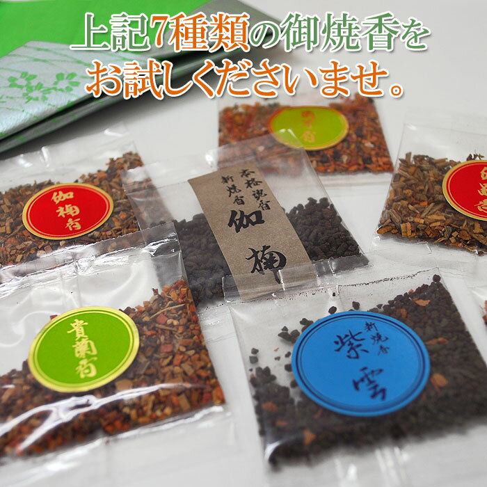 お試し御焼香7種セット香煙5種微煙2種 灰と炭をプレゼントネコポス便2個までOK お焼香 お香 焼香 香木 刻み 沈香 お試し 香り比べ 聞香 香貴特撰 白檀 漢方生薬 丁子 桂皮 山奈 かっ香 セット