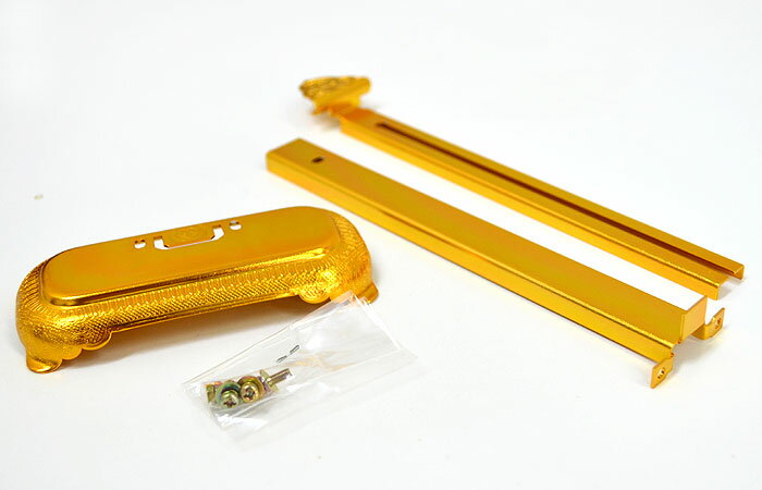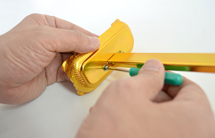 ご本尊様の掛け軸を掛ける台です。ミニ仏壇などでは、掛軸を吊るすための付属品がなかったりしますので、簡単が掛軸台があると便利です。お仏壇の内部を傷つけることなくお祀りできます。ゴールドでシックなデザインです。 ※組立式ですので、プラスドライバーが必要です。 商品名 : アルミ掛軸台(小)アルマイトメッキ サイズ(組立時) : 巾10.5cm(台座)×奥行4.8cm(台座)×高さ29cm〜49cm 適応掛軸サイズ : 30〜70代用お仏壇を傷つけることなく、簡単に掛軸をセットすることができます。 ゴールドでシックなデザインの組立式掛軸台です。 商品はこの状態でのお届けとなります。 組立てご使用ください。 (※組立の際には、プラスドライバーが必要です。) 実際に組み立てた様子を撮影しましたので参考にして下さい。 1.BにAの台座部分を通します。 一番下まで通して下さい。 2.ネジ穴をあわせ、ネジを取り付けます。 3.二箇所ありますので、もう一つも取り付けます。 4.Bの中にCを通します。 B上部のネジ穴にCの隙間部分を合わせてネジで固定します。 これで完成です。とても簡単ですよね。 高さは、約29cm〜約49cmまで調節することができます。 掛軸に合わせて長さを調節して下さい。 (掛軸の30〜70代用です。)