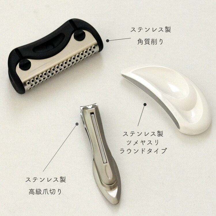海外でも高い評価を得ている日本のメーカー 株式会社グリーンベル社製です。 爪切りと爪やすりと角質削りの3点セットです。 「爪のケア」と気になる「かかとのケア」もできます。 女性にも喜ばれるセットです。 化粧箱入りで、ギフトにも喜ばれます。 商品名 : 匠の技 グルーミングキット 3点セット 【G-3111】 (爪切り・爪やすり・角質削り) メーカー : 株式会社グリーンベル 特長 : 手作り本刃付け仕上げの日本製 高級爪切り 爪やすり 角質削りの3点セット 化粧箱入りでギフトにもGood! セット内容 : [ステンレス製 高級ツメキリ] サイズ:全長 9.3×刃幅 1.2cm 素材:刃部/ステンレス刃物鋼・テコ/亜鉛合金・ヤスリ/ステンレス特殊加工(エッチング)重量:62g [ステンレス製ツメヤスリラウンドタイプ] サイズ:全長 9×幅 3.5cm 素材:ヤスリ/ステンレス特殊加工(エッチング)・ハンドル/ABS樹脂 重量:20.5g [ステンレス製 角質削り] サイズ:全長 8.5×幅 3.5cm 素材:おろし面/ステンレス鋼・グリップ/ポリプロピレン樹脂 重量:29g 原産国 : 日本製切れ味・使用感の良いグルーミングツールは、 海外でも高い評価を得ているグリーンベルの製品です。 その人気の秘密は、日本の伝統技術と、高い品質です。 工場での大量生産が一般的ですが、 グリーンベルのグルーミングシリーズは、職人の手作りです。 熟練のスペシャリストが ひとつひとつ手作りで丹念に仕上げています。 岐阜県関市は、良質の焼刃土と水源があり、 刀鍛治にとって理想的な風土条件を備えた土地です。 ここに多くの刀匠が集まり、有名な刃物産地として 今日まで匠の技が受け継がれてきました。 匠の技シリーズは、 岐阜県関市の関工場で職人によって作られています。 爪ヤスリ・爪切り、さらに角質削りがついた セルフケア3点セットです。 高級な紙箱に入れたギフトセットなので ご自宅用としても、またギフトとしても喜ばれます。 セット内容 職人が仕上げた刃先は、切れ味抜群の逸品です。 熟練のスペシャリストがひとつひとつ丹念に仕上げています。 手作り本刃付け仕上げの高級爪切りです。 爪の丸みに沿ってカットできるスタンダードな曲線刃は、 ステンレス製。 硬い足の爪、巻爪、変形爪にも。 軽い力で良く切れるので、プロもおすすめです。 特殊加工された超微粒ヤスリをテコにデザインした スタイリッシュな爪切りです。 ヤスリのカーブにそって爪をこするだけ! 手にピッタリフィット形と湾曲ヤスリで爪を簡単に削れます。 ヤスリ部分は、ステンレス鋼を特殊加工して、 微粒な目立てを実現しました。 超微粒で爪をなめらかに削り、きれいに仕上げます。 こだわりのアイテムでスマートにケアできる 使いやすい角質削り。 分厚く・頑固な角質も楽に削り取ることができます。 カカト・足裏の分厚く、頑固な角質を 穴のエッジで削り取ります。 爪と気になるかかとのケアにおススメの スタイリッシュなセットです。 ひとつひとつが職人によるもの。 大量生産では得られない逸品セットです。 グリーンベルのこだわりの製品を ひとつのケースにコレクションした この「グルーミングG-3111 3点セット」 専用の化粧箱にお入れしてお届け致します。 母の日や大切な方へのギフトとしても喜ばれる逸品です。 グルーミングキット LA-G-3108/9点セット グルーミングキット LB-G-3109/9点セットト グルーミングキット G-3110/2点セット グルーミングキット G-3111/3点セット グルーミングキット SA-G-3105/4点セット グルーミングキット M-G-3107/5点セット