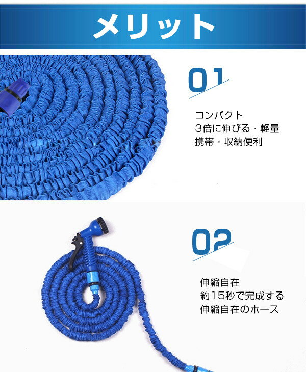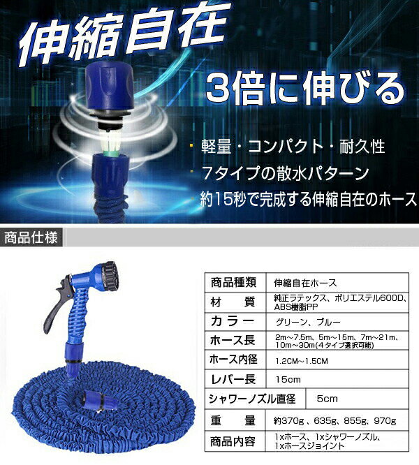 製品仕様・セット内容 製品特徴 3倍に伸びる!伸縮自在ホース! もう絡まない、もうリールにまきつける作業もいらない、通水と同時に約3倍の長さにのびるホースです。 蛇口をひねるだけでぐんぐん伸び、約15秒で完成する伸縮自在のホース! 水圧を利用して、通水で伸びる特種ラテックスを採用し水を通せば約3倍に伸び水を抜くとみるみる縮んで元に戻ります。 子供が片手で楽々持てる軽さするする伸びて絡まらない。昔ながらの散水ホースリールの重い・絡まる・かさばるの三大イライラを解消しました! 製品仕様 素材|純正ラテックス、ポリエステル600D、ABS樹脂PP サイズ/重量(約)|2m~7.5m/370g、5m~15m/800g、7m~21m/850g、10m〜30m/970g ホース内径|1.2cm~1.5cm シャワーノズル直径|5cm レバー長さ|15cm カラー|グリーン、ブルー セット内容 1xホース 1xシャワーノズル 1xホースジョイント 品質の保証 ※保証期間については、商品到着後3ヶ月でございます。ただし正常使用での不具合に限らせて頂きます。ご了承くださいませ。 ※商品に初期不良がある場合は、即時交換のご対応をさせておただきます。 ※水を通してご使用する商品になりますので、当店での検品が細部まで出来かねてしまいますので、必ず到着後すぐにご使用ください。 注意事項 ※予めご家庭の水道蛇口をご確認の上、お買い求め下さい。井戸水ではご利用頂けません。 ※水圧不足の場合、完全にのびない場合があります。 (水圧0.2Mp以下の地域)井戸水、汲み上げポンプではご利用頂けません。古いビル、マンションなど水圧の弱い場合もご利用頂けません。 ※ノズルで水を止めたままの状態で放置しないで下さい。製品の破損や水漏れの原因になります。 ※通常の使用に加え、凍結の恐れがある際には、特に使用後に蛇口を閉め製品及びホース内の水抜きをして下さい。 ※外装ケースが薄いので、送途中に変形が起こした場合がございます。ご了承ください。 ※水を通してご使用する商品になりますので、当店での検品が細部まで出来かねてしまいますので、必ず到着後すぐにご使用ください。