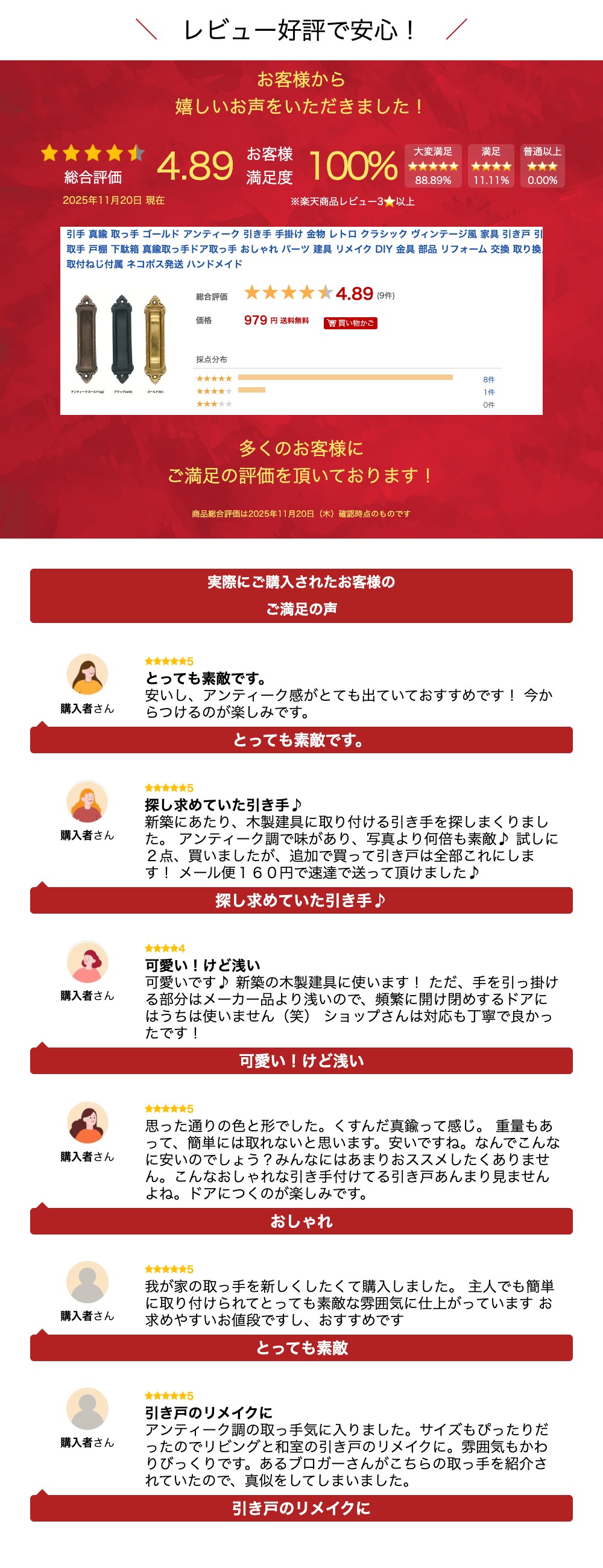 *在庫数を確認のうえご注文お願い致します* 商品詳細 -infomation- 納期在庫有の場合:2営業日以内に発送在庫切れの場合:納期をご連絡致します不足商品の取扱い商品名 引手取っ手 J009 サイズ サイズ 幅26x高さ119x奥行9mm 開口サイズ 幅21x高さ74mm ※ハンドメイドで製作している為、サイズには多少の誤差があります。 材質 真鍮 生産国 インドネシア カラー アンティークゴールド(antique)、ブラック(black)、ゴールド(polished brass)、シルバー艶消し(silver doff.) 付属品 木ねじ 長さ13mm 長さ10mm、13mm、16mm、20mm、25mmを用意しています。 ご注文時に長さ指定がある際は、ご指定長さの木ねじを付属いたします。 発送について 購入金額3980円以上で送料無料(税込み) ※追跡可能メール便で発送致します。 商品の特徴 ●オイルステイン塗装(アンテイークゴールド/ブラック) ※着色には炭、植物オイルを使用しています。 炭の含有量により黒味の度合いが変わります。 ハンドメイドの為、サイズ・色合いが多少異なる 場合もあります。 予めご了解お願いいたします。 ●真鍮磨き仕上げ(ゴールド) ※真鍮素地を磨き、透明クリア塗装で仕上げています。 ●シルバー仕上げ ※真鍮素地にシルバー艶消し塗装で仕上げています。 お手入れ 真鍮商品は長期間埃等が付着すると変色の原因になります。 布などを使用して埃等を取り除くと、長期間に渡り商品の風合いをお楽しみいただけます。 関連商品引手 真鍮 ゴールド アンティーク レトロ クラシック ヴィンテージ風...引手 真鍮 ゴールド アンティーク レトロ クラシック ヴィンテージ風...引手 真鍮 ゴールド アンティーク レトロ クラシック ヴィンテージ風...957円1,045円891円引手 真鍮 ゴールド アンティーク レトロ クラシック ヴィンテージ風...引手 真鍮 ゴールド アンティーク レトロ クラシック ヴィンテージ風...引手 真鍮 ゴールド アンティーク レトロ クラシック ヴィンテージ風...891円1,045円1,188円引手 真鍮 ゴールド アンティーク レトロ クラシック ヴィンテージ風...引手 真鍮 ゴールド アンティーク レトロ クラシック ヴィンテージ風...引手 真鍮 ゴールド アンティーク レトロ クラシック ヴィンテージ風...1,221円1,177円1,188円引手 真鍮 ゴールド アンティーク レトロ クラシック ヴィンテージ風...引手 真鍮 ゴールド アンティーク レトロ クラシック ヴィンテージ風...シェル 取っ手 ゴールド アンティーク 貝殻 パーツ 真鍮取っ手 レト...715円596円957円関連ワード: 引手 真鍮 取っ手 アンティーク ゴールド ブラス 引き手 ドア 引戸 おしゃれ ヴィンテージ風 DIY リメイク 交換 戸棚 クラシック ヴィンテージ 家具 金具 取付ねじ付属 ネコポス発送 幅26 高さ119 奥行9 ハンドメイド ブラック シルバー 艶消し 真鍮取っ手ドア取っ手 下駄箱 建具 アンティークゴールド
