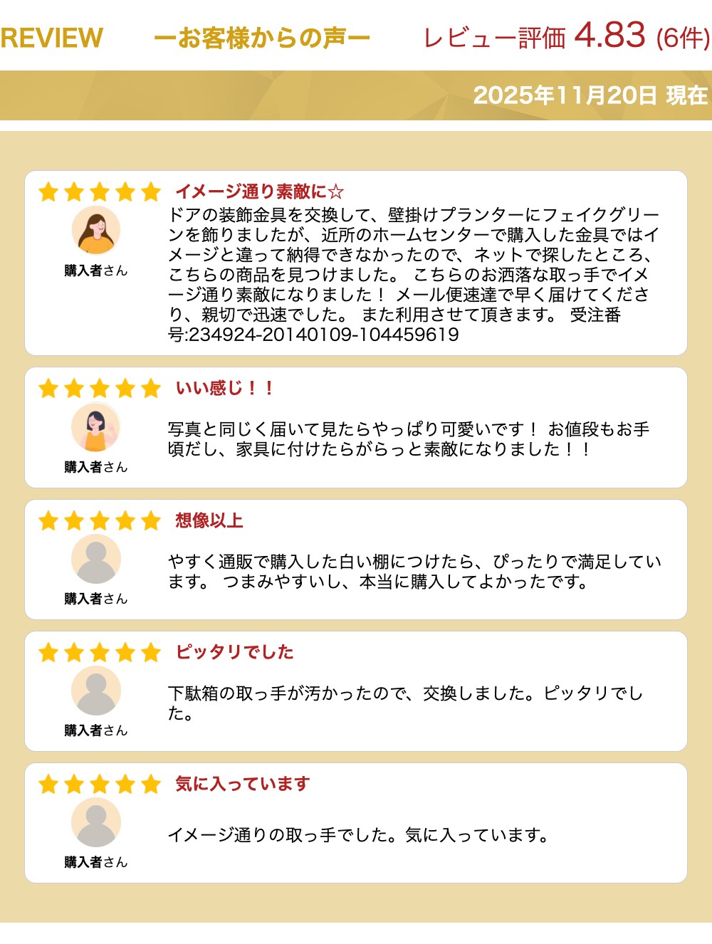 *在庫数を確認のうえご注文お願い致します* 商品詳細 -infomation- 納期在庫有の場合:2営業日以内に発送在庫切れの場合:納期をご連絡致します不足商品の取扱い商品名 つまみ取っ手 N010 サイズ サイズ 直径18x奥行20mm ベース 直径20mm ※ハンドメイドで製作している為、サイズには多少の誤差があります。 材質 真鍮 生産国 インドネシア カラー アンティークゴールド(antique)、ブラック(black)、ゴールド(polished brass)、シルバー艶消し(silver doff.) 付属品 トラスねじ M4(4mm)x長さ25mm ※ご注文時【備考欄】に取付板の厚みをご記入頂けると、適合する長さのねじに変更致します。 発送について 購入金額3980円以上で送料無料(税込み) ※追跡可能メール便で発送致します。 商品の特徴 ●オイルステイン塗装(アンテイークゴールド/ブラック) ※着色には炭、植物オイルを使用しています。 炭の含有量により黒味の度合いが変わります。 ハンドメイドの為、サイズ・色合いが多少異なる 場合もあります。 予めご了解お願いいたします。 ●真鍮磨き仕上げ(ゴールド) ※真鍮素地を磨き、透明クリア塗装で仕上げています。 ●シルバー仕上げ ※真鍮素地にシルバー艶消し塗装で仕上げています。 お手入れ 真鍮商品は長期間埃等が付着すると変色の原因になります。 布などを使用して埃等を取り除くと、長期間に渡り商品の風合いをお楽しみいただけます。 関連商品とって 取っ手 取手 つまみ 真鍮 ゴールド ブラック シルバー レト...とって 取っ手 取手 つまみ 真鍮 ゴールド ブラック シルバー レト...とって 取っ手 取手 つまみ 真鍮 ゴールド ブラック シルバー レト...627円572円506円とって 取っ手 取手 つまみ 真鍮 ゴールド ブラック シルバー レト...とって 取っ手 取手 つまみ 真鍮 ゴールド ブラック シルバー レト...とって 取っ手 取手 つまみ 真鍮 扉のつまみ ゴールド ブラック シ...825円891円748円とって 取っ手 取手 つまみ 真鍮 ゴールド ブラック シルバー レト...とって 取っ手 取手 つまみ 真鍮 ゴールド ブラック シルバー レト...とって 取っ手 つまみ 真鍮 ゴールド ブラック シルバー レトロ ク...836円803円891円とって 取っ手 取手 つまみ 真鍮 ゴールド アンティーク レトロ ク...とって 取っ手 取手 つまみ 真鍮 ゴールド ブラック シルバー レト...とって 取っ手 取手 つまみ 真鍮 ゴールド ブラック シルバー レト...561円572円458円