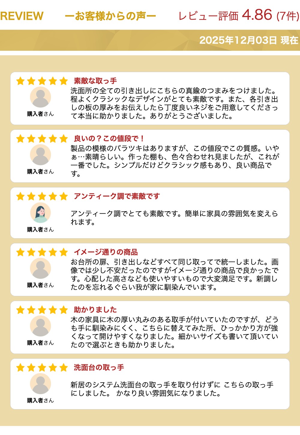 *在庫数を確認のうえご注文お願い致します* 商品詳細 -infomation- 納期在庫有の場合:2営業日以内に発送在庫切れの場合:納期をご連絡致します不足商品の取扱い商品名 つまみ取っ手 N032 サイズ サイズ 直径27x奥行20mm ベース 直径17mm ※ハンドメイドで製作している為、サイズには多少の誤差があります。 材質 真鍮 生産国 インドネシア カラー アンティークゴールド(antique)、ブラック(black)、ゴールド(polished brass)、シルバー艶消し(silver doff.) 付属品 トラスねじ M4(4mm)x長さ25mm ※ご注文時【備考欄】に取付板の厚みをご記入頂けると、適合する長さのねじに変更致します。 発送について 購入金額3980円以上で送料無料(税込み) ※追跡可能メール便で発送致します。 商品の特徴 ●オイルステイン塗装(アンテイークゴールド/ブラック) ※着色には炭、植物オイルを使用しています。 炭の含有量により黒味の度合いが変わります。 ハンドメイドの為、サイズ・色合いが多少異なる 場合もあります。 予めご了解お願いいたします。 ●真鍮磨き仕上げ(ゴールド) ※真鍮素地を磨き、透明クリア塗装で仕上げています。 ●シルバー仕上げ ※真鍮素地にシルバー艶消し塗装で仕上げています。 お手入れ 真鍮商品は長期間埃等が付着すると変色の原因になります。 布などを使用して埃等を取り除くと、長期間に渡り商品の風合いをお楽しみいただけます。 関連商品とって 取っ手 取手 つまみ 真鍮 ゴールド ブラック シルバー レト...とって 取っ手 取手 つまみ 真鍮 ゴールド ブラック シルバー レト...とって 取っ手 取手 つまみ 真鍮 扉のつまみ ゴールド ブラック シ...836円825円748円とって 取っ手 つまみ 真鍮 ゴールド ブラック シルバー レトロ ク...とって 取っ手 取手 つまみ 真鍮 ゴールド ブラック シルバー レト...とって 取っ手 取手 つまみ 真鍮 ゴールド ブラック シルバー レト...891円891円803円とって 取っ手 取手 つまみ 真鍮 ゴールド ブラック シルバー レト...とって 取っ手 取手 つまみ 真鍮 ゴールド ブラック シルバー レト...とって 取っ手 取手 つまみ 真鍮 ゴールド ブラック シルバー レト...792円627円748円とって 取っ手 取手 つまみ 真鍮 ゴールド ブラック シルバー レト...とって 取っ手 取手 つまみ 真鍮 ゴールド ブラック シルバー レト...とって 取っ手 取手 つまみ 真鍮 ゴールド ブラック シルバー レト...748円748円572円