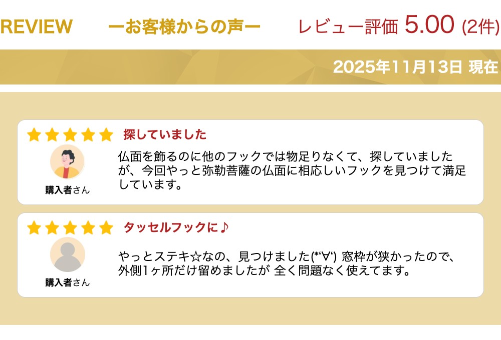 *在庫数を確認のうえご注文お願い致します* 商品詳細 -infomation- 納期 在庫有の場合:2営業日以内に発送在庫切れの場合:納期をご連絡致します不足商品の取扱い商品名 フック U044 サイズ サイズ 幅33x高さ70x奥行39mm ベース 幅29x高さ16mm ※ハンドメイドで製作している為、サイズには多少の誤差があります。 材質 真鍮 生産国 インドネシア カラー アンティークゴールド(color:antique) 付属品 木ねじ(鉄製、ブロンズ色) 長さ25mm 長さ16mm、20mm、25mm、32mmを用意しています。 ご注文時に長さ指定がある際は、ご指定長さの木ねじを付属いたします。 発送について 購入金額3980円以上で送料無料(税込み) ※追跡可能メール便で発送致します。 商品の特徴 オイルステイン塗装 ※着色には炭、植物オイルを使用しています。 炭の含有量により黒味の度合いが変わります。 ハンドメイドの為、サイズ・色合いが多少異なる 場合もあります。 予めご了解お願いいたします。 お手入れ 真鍮商品は長期間埃等が付着すると変色の原因になります。 布などを使用して埃等を取り除くと、長期間に渡り商品の風合いをお楽しみいただけます。 関連商品フック コートフック 真鍮 ゴールド アンティーク レトロ クラシック...フック コートフック 真鍮 ゴールド アンティーク レトロ クラシック...フック コートフック 真鍮 ゴールド アンティーク レトロ クラシック...1,430円1,485円1,782円フック コートフック 真鍮 ゴールド アンティーク レトロ クラシック...フック コートフック 真鍮 ゴールド アンティーク レトロ クラシック...フック コートフック 真鍮 ゴールド アンティーク レトロ クラシック...1,463円1,430円1,518円フック コートフック 真鍮 ゴールド アンティーク レトロ クラシック...フック コートフック 真鍮 ゴールド アンティーク レトロ クラシック...フック コートフック 真鍮 ゴールド アンティーク レトロ クラシック...1,925円1,364円1,573円フック コートフック 真鍮 ゴールド アンティーク レトロ クラシック...フック コートフック 真鍮 ゴールド アンティーク レトロ クラシック...真鍮 フック 壁掛け ウォールフック ゴールド ネジ止め コートフック...1,639円1,727円748円関連ワード: フック コートフック 真鍮 ゴールド アンティーク アンティークゴールド レトロ クラシック ヴィンテージ風 帽子ハンガー インテリアパーツ 建具 DIY リメイク 修理 交換 取り換え オイルステイン塗装 取付ねじ付属 壁掛けハンガー 真鍮製 インドネシア製 木ねじ 玄関ドア ウォールハンガー ビンテージ 手作り インテリア 家具 装飾 デザイン