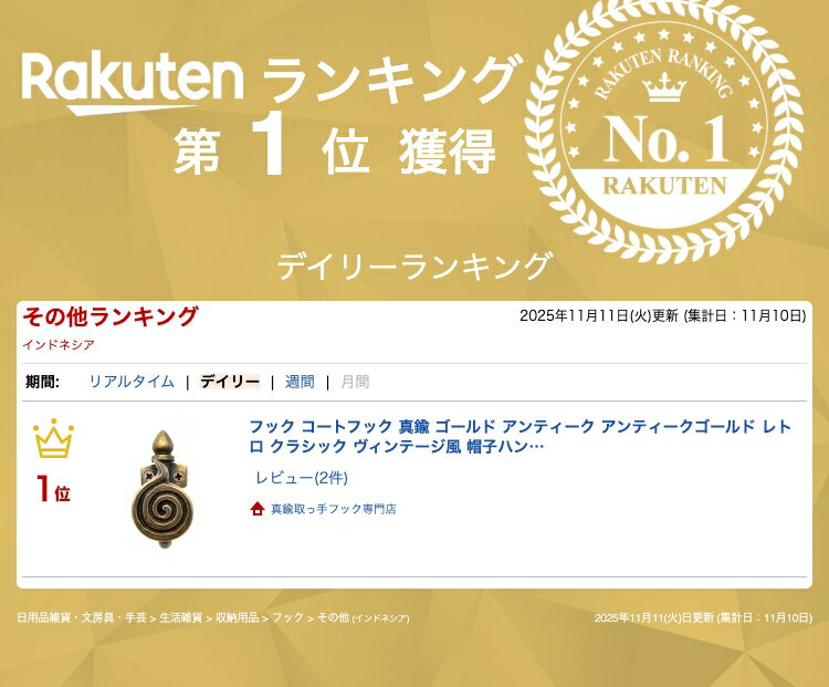 フック コートフック 真鍮 ゴールド アンティーク アンティークゴールド レトロ クラシック ヴィンテージ風 帽子ハンガー インテリアパーツ 建具 建材 リメイク DIY 修理 交換 取り換え オイルステイン塗装 取付ねじ付属 インドネシア製 手作り