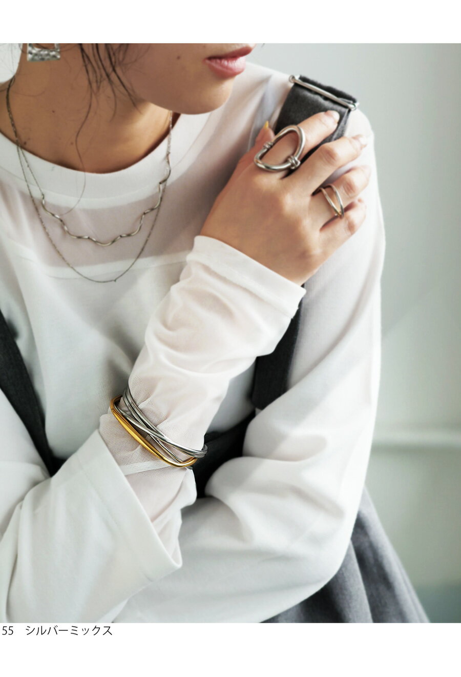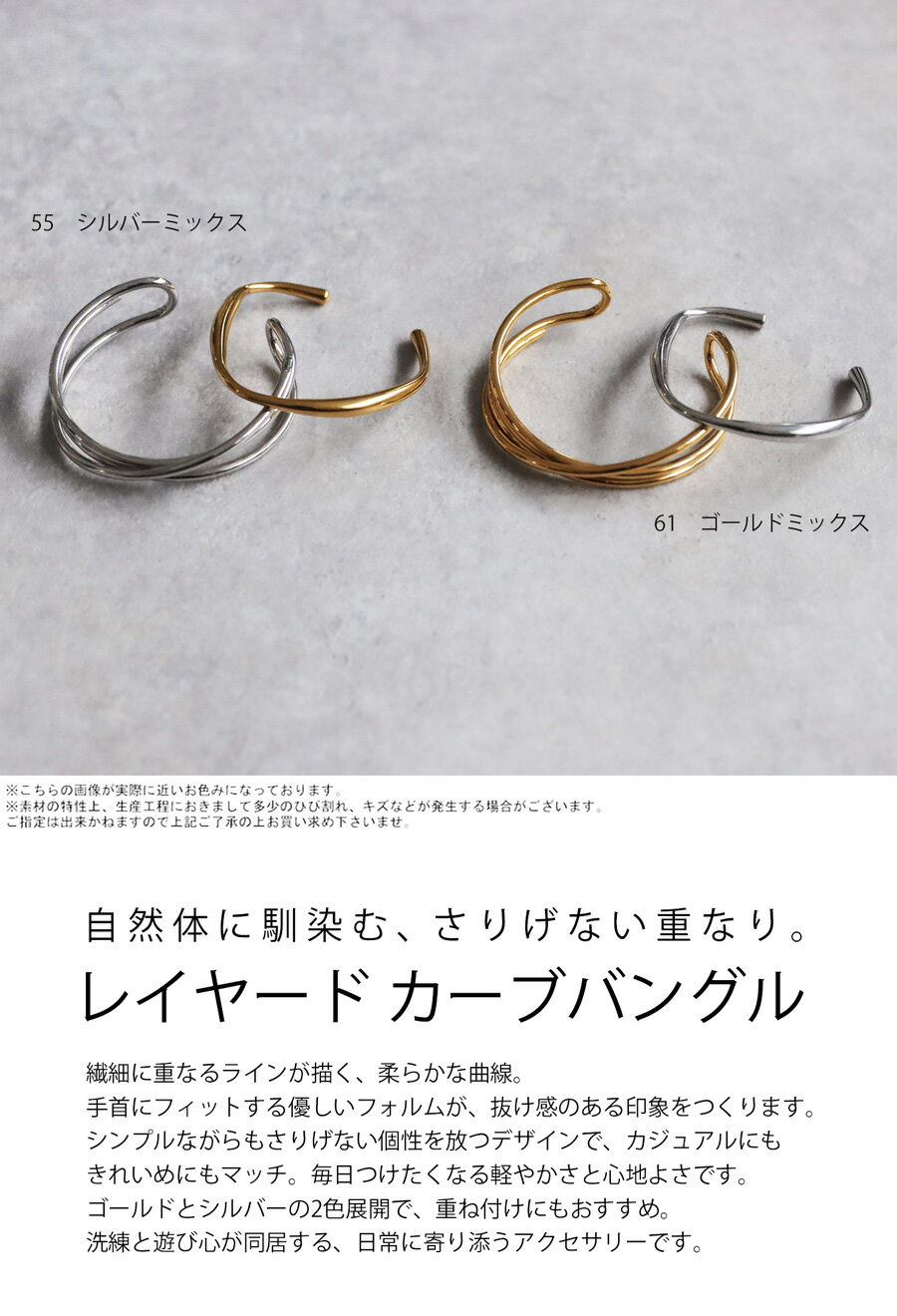 ▼▼▼ 緩やかに交差するラインが描く、静かな美しさ。 印象的でありながら主張しすぎないデザインが、日常にそっと寄り添うレイヤードカーブバングルです。 繊細に重ねられたラインが描き出す、柔らかなカーブが特徴。 手首にしっくりとフィットするフォルムは、抜け感を演出しながらも女性らしさを引き立てます。 カジュアルにもきれいめにも合わせやすい絶妙なバランスで、着けるだけでスタイリングに奥行きをプラス。 単品でシンプルに、重ね付けで華やかにと、気分に合わせたアレンジも自在です。 洗練された印象を生む曲線美は、手元に視線を集め、さりげない存在感を放ちます。 ゴールドとシルバーの2色展開で、肌なじみの良い光沢感が魅力的。 それぞれのカラーが放つニュアンスは異なり、ゴールド(ゴールドカラー・金色・Gold)は温かみのある印象に、シルバー(銀・ぎん・Silver)は凛とした清潔感を添えてくれます。 素材にはニッケルフリー加工が施されており、金属アレルギーが気になる方にも配慮されたつくりになっています。 毎日つけたくなるような軽やかさと、肌あたりのやさしさも魅力。 シーズンレスで使える汎用性の高さと、ミニマルなデザイン性を両立した一本は、ギフトにもおすすめです。 スタイリングのアクセントとして、オンにもオフにも活躍する万能アクセサリー。 洗練された中にある抜け感が、大人のおしゃれを引き立てます。 【カラー】ゴールド/シルバー 【着用シーズン】春・夏・秋・冬・オールシーズン 【使用シーン】デイリー、お出かけ、ショッピング、旅行、女子会、オフィス、ギフト、リラックスタイム サイズ モチーフの大きさ 約6.5 重さ 約26g/約17g ※サイズは目安にご参考下さいませ。※サイズには多少の個体差がある場合がございます。ご了承くださいませ。※低アレルギー素材です。 素材 ステンレス ※【商品・配送について】ご購入前にこちらの注意事項をご確認ください。 Please check the notes for this item and check this shipping note before you buy.