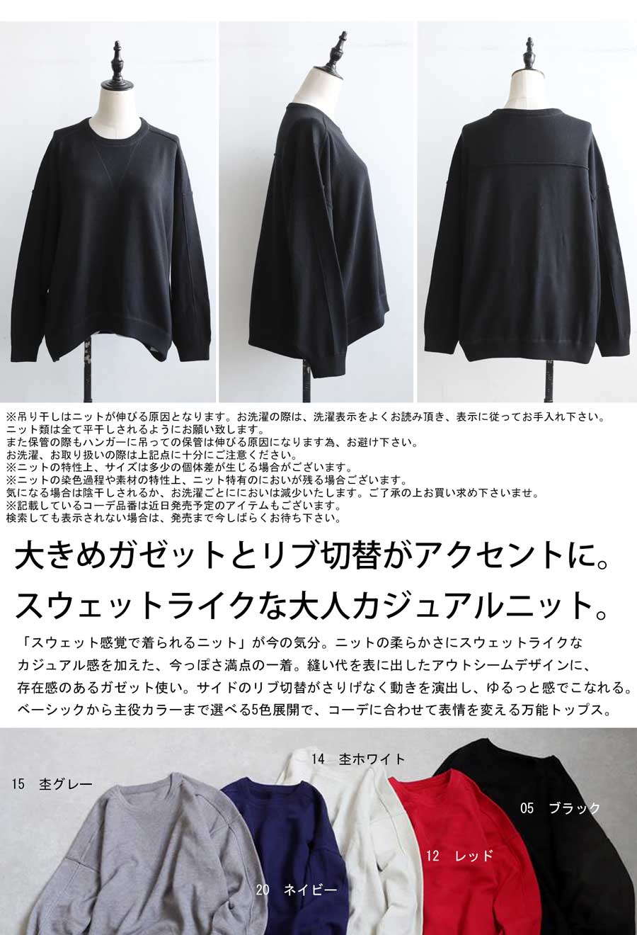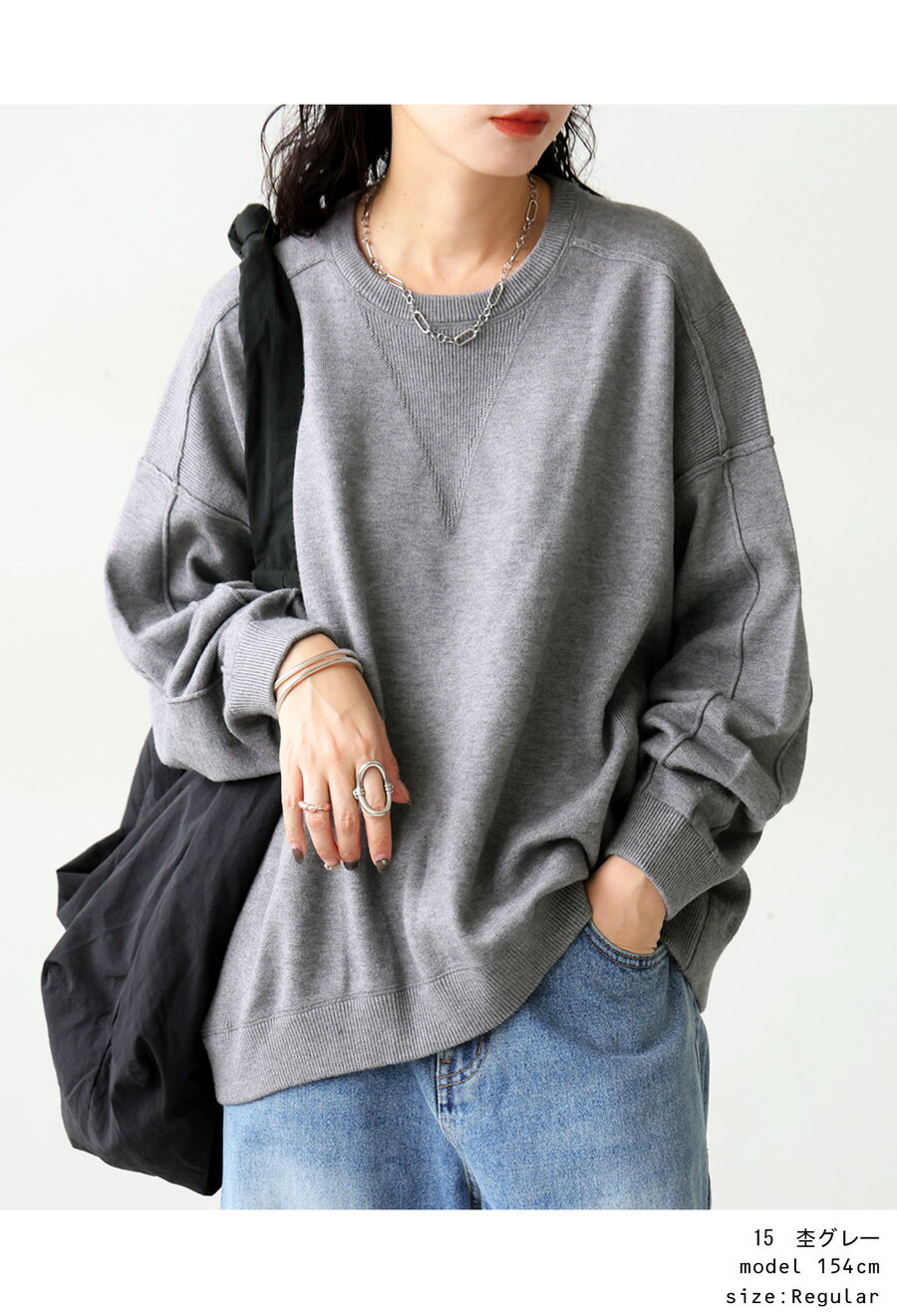 ▼▼▼ 着るだけで心ときめく。自分らしさを自由に楽しむ『antiqua(アンティカ)』 スウェットのような表情をもつ、ラフで女性らしい印象のスウェットライクニットトップス。 縫い代の表出しのディテールとリブ切替がアクセントになり、シンプルながらも存在感のあるデザインです。 身幅はゆったりとしており、長めの丈感で体型を自然にカバー。 ネックラインはクルーネックで首元をすっきりと見せ、袖丈は手元をしっかり覆う長袖仕様。 形状はベーシックなシルエットながら、大きめのガジェットが個性を引き立てます。 ユニセックス仕様のため、カップルや家族でシェアする着こなしもおすすめ。 カラー展開も豊富で、杢ホワイト(白・しろ・White)、杢グレー(グレー・灰色・Gray)、ネイビー(紺・こん・ネイビーブルー・Navy)、レッド(赤・あか・Red)、ブラック(黒・くろ・Black)をご用意。 【カラー】杢ホワイト/杢グレー/ネイビー/レッド/ブラック 【着用シーズン】秋・冬 【使用シーン】デイリー、お出かけ、旅行、ワンマイル、カフェ巡り、レイヤードスタイル、ショッピング ■メンズ品番za-00255zこちらよりご確認お願いいたします。 ※近日発売予定のアイテムは、画像が表示されていない、またリンクが繋がらない場合が御座います。今しばらくお待ち下さい。 サイズ Regular Plus 前丈 60 69 後丈 64 74 胸囲(脇下) 126 132 肩幅 60 69 袖丈 46 48 アームホール 54 56 天幅 18 20 前下がり 9 10 ※平置き採寸です。サイズは目安にご参考下さいませ。 ※素材の特性上、平置き採寸のサイズと実際の着用サイズとは異なります。サイズ表から±3cm差がある場合がございますので着用イメージは画像をご確認いただき、ご了承の上、お買い求めくださいませ。 素材 レーヨン45% ポリエステル28% ナイロン27% ※【商品・配送について】ご購入前にこちらの注意事項をご確認ください。 Please check the notes for this item and check this shipping note before you buy.