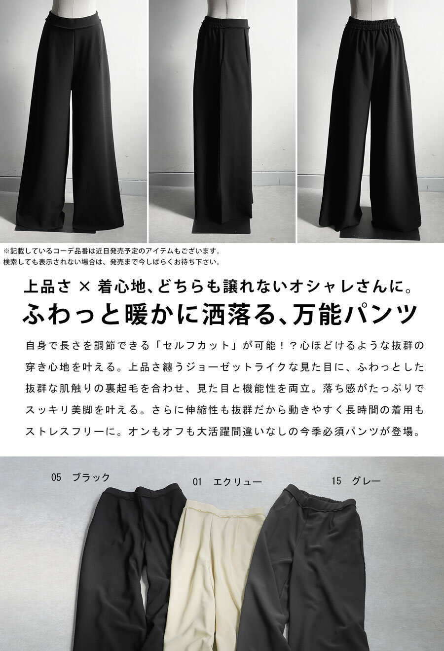 ▼▼▼ 着るだけで心ときめく。自分らしさを自由に楽しむ『antiqua(アンティカ)』 ふんわりとした裏起毛の肌ざわりで、冷え込む季節も暖かく包み込むワイドパンツです。 ワイドな形状でゆったりとした履き心地ながら、美しいシルエットを演出し体型カバーにも適しています。 丈感はご自身で調整できるセルフカット仕様で、裾がほどけにくい設計が特長です。 表地は上品なジョーゼット風で、柔らかく落ち感のある素材が動きに品を添えます。 ウエストはアウトシーム風の切りっぱなしデザインで、すっきりとした印象と快適な着心地を両立。 同素材のトップス(品番:PY-00821)とセットアップで着用すれば、統一感のある大人のスタイルが完成します。 カジュアルにもきれいめにも馴染む万能パンツです。 カラーはブラック(黒・くろ・Black)、グレー(灰色・グレイ・Gray)、エクリュ(生成り・アイボリー・Ecru)の3色展開です。 【カラー】ブラック/グレー/エクリュ 【着用シーズン】秋・冬 【使用シーン】デイリー、お出かけ、旅行、ワンマイル、リラックスタイム、在宅ワーク、カフェ巡り ■トップス品番py-00821こちらよりご確認お願いいたします。 ※近日発売予定のアイテムは、画像が表示されていない、またリンクが繋がらない場合が御座います。今しばらくお待ち下さい。 サイズ 丈(脇) 107 ウエスト(全ゴム伸縮あり) 68〜114 ヒップ 104 股上 38 股下 72 ※平置き採寸です。サイズは目安にご参考下さいませ。※サイズには個体差±3cmがある場合がございます。ご了承の上、お買い求めくださいませ。 ※切りっぱなしデザインの為、裁断面にほつれがあります。ほつれが気になる場合は無理に引っ張らず気になる箇所をはさみで取り除いてご使用下さいませ。※こちらの商品にはセットアップ商品が御座いますが、生産時期や生地の調達状況等で、色合いや風合いに違いが発生します。ご了承の上、お買い求め下さいませ。 素材 ポリエステル95% ポリウレタン5% ※【商品・配送について】ご購入前にこちらの注意事項をご確認ください。 Please check the notes for this item and check this shipping note before you buy.