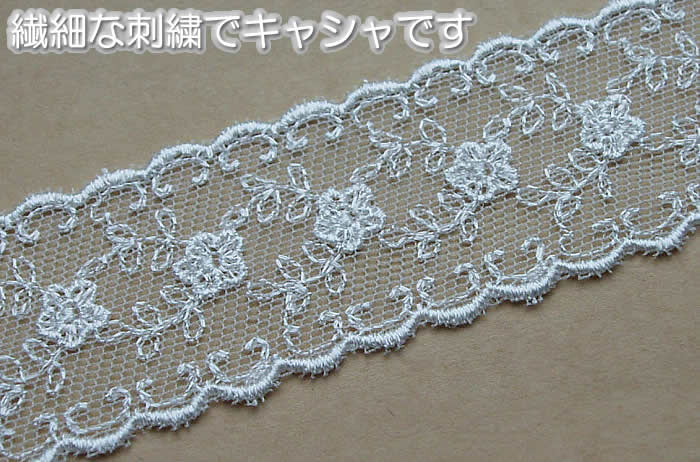 当店の業務用レースたっぷり50m 送料無料&メーターあたり150円でお買得! かわいい小花刺繍の両山チュールレース♪ 高品質の日本製☆薄手でキャシャな感じです -------------------------------------- 【数量/価格】 50m巻きの価格です -------------------------------------- 【商品仕様】 幅: 約2.8cm幅 色: オフ白 素材:ナイロン・レーヨン