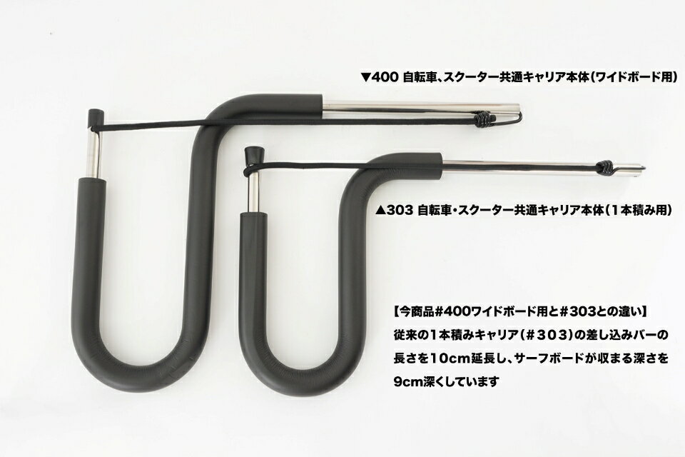 ■キャリアのパイプ径は19.1mmあります。別売りの自転車・スクーターアタッチメントと組み合わせてご使用ください。 ■サビに強いステンレス製です。 ■従来の1本積みキャリア(#303)の差し込みバーの長さを10cm延長し、サーフボードが収まる深さを9cm深くしたワイドボード用キャリア ■幅の広い、オルタナティブ系ボード、スポンジボード、ロングボードがハンドルやブレーキレバーから距離が取れ、カーブを曲がる際にボードに接触するのを極力防ぐ仕様