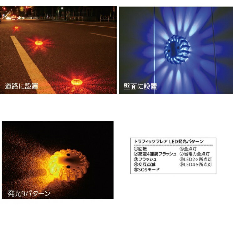 充電式 LEDトラフィックフレア LED発円灯 ○円形型でLEDが360°照射するので視認性が高い充電式の回転灯。 ※AC100V・DC12V・USB電源の3通りから充電可能 ○裏面にはマグネットがついており、重機や鉄製の壁面にも取付可能。 ○材質にはポリカーボネイト・TRRゴム使用、衝撃にも強く、防雨構造となっています。 ○発光パターンは回転・フラッシュ・全点灯等全9パターン <仕様> ・外形サイズ:直径110×厚み35mm ・重量:約200g ・LED:超高輝度LED×16個 ・点灯時間:電源ON時に点灯・点滅 ・電源:AC100V/DC12V/USBパソコン ・電池:リチウムイオン電池 種類 pse/JETマーク 届出事業所 applicant 定格入力電圧 125v以下のもの 合格書類確認済 ・連続点灯時間:約8時間(満充電時・回転の場合) ○付属 充電器 <充電機能付専用ケースあります> <垂直方向にも照射する赤色タイプあります> 工事用点滅灯 工事用保安灯 LED点滅灯 工事保安用品