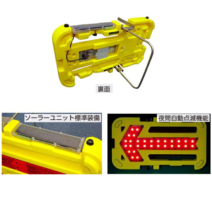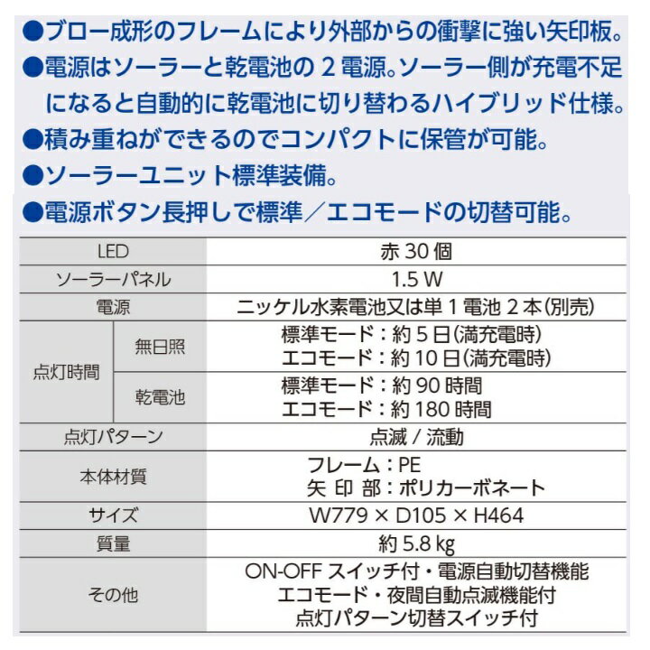 LED矢印板 ハイブリッドフラッシャーパネル ○ブロー成形のフレームにより、外部からの衝撃に強いLED矢印板です。 ○電源はソーラーと乾電池の2電源。ソーラー側が充電不足になると、自動的に乾電池に切り替わるハイブリッド仕様です。 ○エコモードで使用すると無日照は約10日間です。 ○積み重ねができるので、コンパクトに保管ができます。 ○電源ボタン長押しで標準/エコモードの切替可能。 <仕様> ・LED:赤・30個 ・ソーラーパネル:出力1.5W ・電源:ニッケル水素電池又は単一乾電池2本(別売) ・寸法:(幅W×高さH×奥行D)(mm)779×464×105 ・質量:約5.8kg ・本体材質:フレーム/PE 矢印部/ポリカーボネート <点灯時間> ・ソーラーの場合無日照:約5日(エコモード約10日) ・乾電池の場合:約90時間(エコモード約180時間) ・機能:点灯パターン切替スイッチ、電源自動切替機能 点灯方式点滅・流動 、エコモード、夜間自動点滅機能付 キタムラ産業