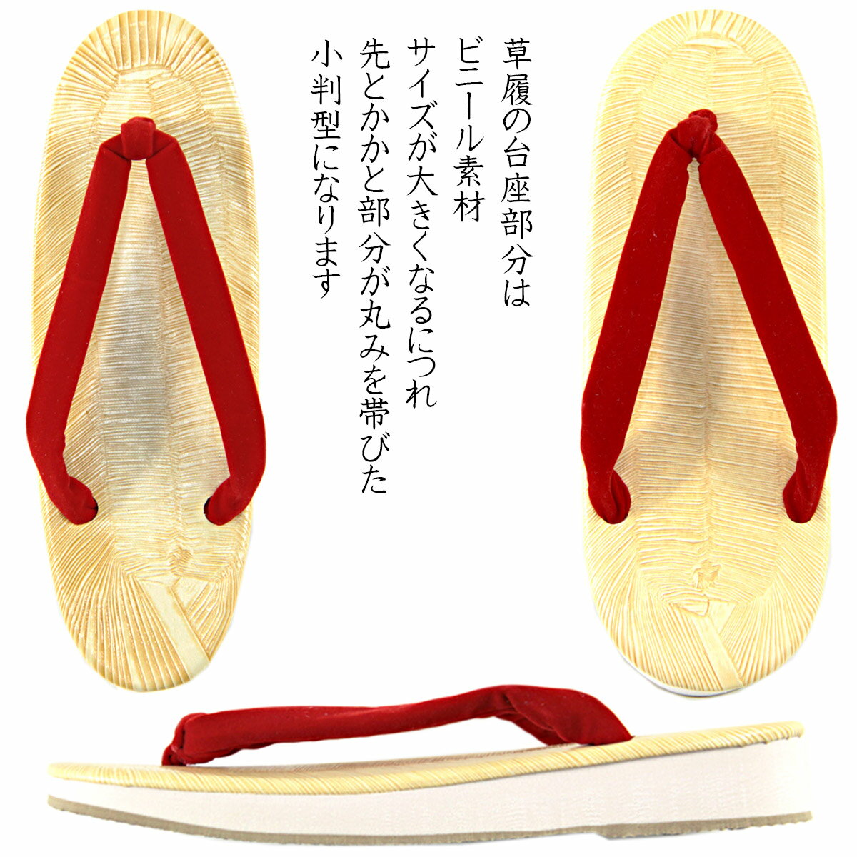 軽装草履 女物 お祭り用 大きいサイズ 夏祭りのマストアイテム 女性用雪駄。 台座は黄畳、サンドと呼ばれる滑り止め加工が施された、軽くて履きやすいスポンジ底の草履です。 半纏(はんてん)にはもちろん、作務衣や甚平、浴衣にもお履きいただけます。 サンダル感覚で普段履きにもお使いいただけます。 こちらの草履は5サイズ展開です。 小さいサイズのMサイズから、特大サイズの4Lサイズ(実寸27cm)までございます。 足が大きくてお困りの方や、外人さんにもおススメです。 雪駄は、踵を出して履くのが粋とされておりますので、1-2cm程度は出ても問題ありませんが、サンダル感覚で履かれる場合は実寸より大きめで選ばれることをおすすめ致します。 サイズ 約 cm 表記 M L LL 長さ 23.5 23.5 24.5 巾 7.8 8.8 9.0 高さ 3.0 3.5 対応サイズ 22.5-23.0 23.5-24.0 24.5-25.0 表記 3L 4L 長さ 25.5 27.0 巾 9.3 9.3 高さ 3.5 対応 サイズ 25.5-26.5 27.0以上 品質表示 色 赤鼻緒 表 ビニール 底 スポンジ 鼻緒 別珍風布 ハイミロン 生産地 日本製 レターパックプラス配送商品 配送のご注意 鼻緒部分をやや押し潰しての厚みを抑えた梱包となります。 ご了承ください。 ・小型宅配便(レターパックプラス)配送商品 配達形態は宅配便と同じ受領印をいただく手渡し配達です。 地域によりますが配送日数は当店より商品出荷後、1-3日程度。 追跡番号より配達状況も確認できます。 ・配送のご注意 悪天候等による交通機関の影響で配達日数が遅れる場合があります。 お届け日時の指定は出来ませんのでご注意ください。 日時指定をご希望の方は宅配便をご選択ください。 (宅配便料金がかかりますのでご了承くださいませ。) 別途送料についてのご注意 別途送料を御選択の場合は設定送料にての御注文確定後に送料金額の変更となります。 送料無料ラインの対象となったお買い物につきましては配送方法はこちらにお任せとなります。 お急ぎやご指定日がある場合、またはギフト包装などのサービスを御希望の場合は送料変更の御了承をお願い致します。 送料の変更が御了承頂けない場合は、こちらで設定させて頂いている配送方法での発送となりますのでご理解ください。 こちらも どうぞ ★あおいTOPページ★ ★下駄各種★ ★浴衣小物★ ★かご巾着★ ★浴衣関係★ ★浴衣帯 ★足袋★ ★草履★ ★着付小物★夏祭りのマストアイテム 女性用雪駄 粋な女の軽装草履 鼻緒は太めのベルベット状起毛素材 ビニール製黄畳の台座 サンドと呼ばれる滑り止め加工が施された 軽くて履きやすいスポンジ底 サイズも豊富に5種類 M(実寸23.5cm 細め) L(実寸23.5cm) 幅広ワイドサイズのLL(実寸24.5cm) 大きいサイズの3L(実寸25.5cm) 特大サイズの4L(実寸27cm) 足が大きくてお困りの方や 外人さんにもおススメ こちらもどうぞ カテゴリトップ 下駄各種 祭り雪駄