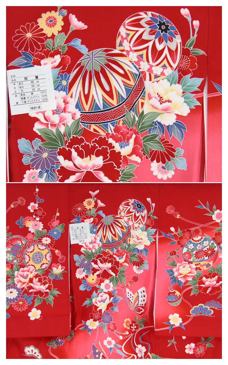 宮参り着物 -61- 熨斗目 女の子用 絹100% 金彩 赤 手鞠/蝶々/花柄