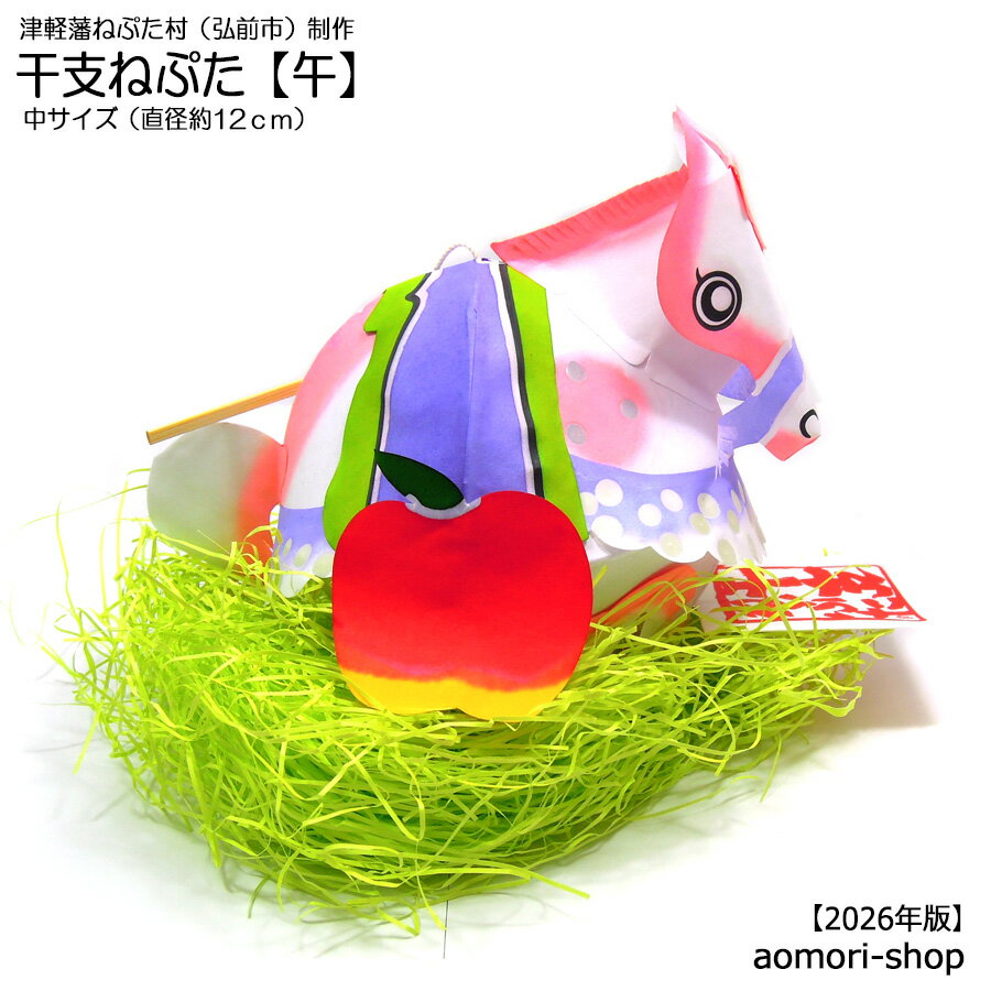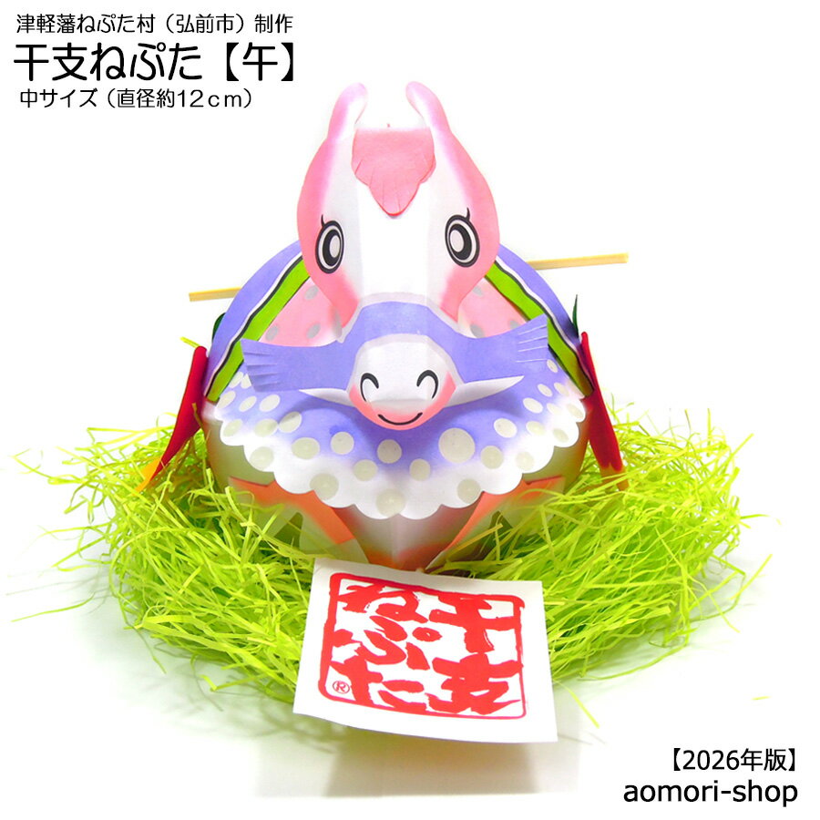★2024年4月1日より価格改定。 ▼必ずご一読いただきますようお願い申し上げます。 ●納期について(ご注文確認から発送までに1週間程度かそれ以上) ご注文確認(入金確認)から商品確保・発送までに1週間程度かそれ以上のお時間を要することが見込まれております。※最大で2週間程度・休業日を除く また、ご注文が殺到した場合は上記の納期よりもさらにお時間を要する可能性があります。大変恐縮ではございますが、気長にお待ちいただけましたら幸いです。 なお、ご注文が一定数を超えた場合、製作が追いつかなくなるため一時的に販売を休止させていただきます。職人さんの製作状況を確認しながらの販売再開となります。 ●「干支ねぷた」と一緒に注文いただいた商品がある場合 発送はまとめて1個口(常温便)での対応となります。一部商品だけを先に発送するなどの対応はいたしかねます。 ●【冷蔵品】【冷凍品】は同梱できません。 冷蔵品・冷凍品を一緒にご注文いただいた場合は、お買い物合計金額にかかわらず追加送料(クール便送料1180円〜)を頂戴し、干支ねぷたとは別送するよう手配をさせていただきます。干支ねぷたが確保でき次第、同じ日付で発送いたします。また、干支ねぷたは紙でできておりますので、非常に軽いです。重量のある品物と同梱した場合、万全の状態で梱包したとしても配送中につぶれる可能性は否定できませんので、りんごやりんごジュース、ビン類や缶詰等の重たいものとの同梱はオススメいたしません。 ●発送に際し、外箱に使用済みのダンボールの再利用や他の商品の専用箱等を使用することがあります。 大変恐縮ではございますが、あらかじめご了承いただきますようお願い申し上げます。 ・・・・・・・・・・・・・・・・・・・・ ◎商品説明 日本有数の桜の名所で知られる弘前公園すぐ横の観光施設「津軽藩ねぷた村(青森県弘前市)」で制作されている、年の瀬の風物詩【干支ねぷた】。津軽の伝統品・金魚ねぷたをベースに作られる干支ねぷたは、今年で41年目を迎えたロングセラー商品です。 ▼2025年11月17日発売、2026年版「午ねぷた」 金魚ねぷたの骨組みにアレンジを加えて制作されている「干支ねぷた®」は今年で41年目を迎え、2025年の「巳ねぷた」から2026年の干支である「午ねぷた」にバトンタッチとなります。2026年版の「午ねぷた」のデザインはメリーゴーランドの馬をモチーフに全体的にパステルカラーの色合いとメルヘンチックで愛らしい白馬に仕上がりました。 馬の鞍(くら)の両側に青森りんごを携え、鞍のうしろ面には津軽の人々の拠り所である津軽富士・岩木山がラインに沿って模しているなど、青森らしさが随所にあしらわれています。 2025年、青森りんごは「りんご植栽150周年」を迎えました。基幹産業であるりんごはもちろんのこと、青森県のさらなる飛躍と、皆様に福が訪れ、何事も「う」「ま」くいき、馬のように駆け上がれる2026年であるようにと祈りながら、津軽藩ねぷた村の職人らがひとつずつ手作りで製作しています。 【サイズ寸法】−中サイズ− ケースなし…本体の直径約12cm 【クリアケース入り寸法】 縦・横約16cm、高さ約17cm ※【注意】…LEDライト付きのねぷたではありません。 ※【干支ねぷた】は津軽藩ねぷた村のオリジナル商品です。 ▼関連商品… ・金魚ねぷた&干支ねぷた各種