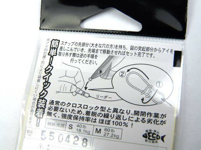 ルアーアクションに定評のある「音速ラウンドスナップ」の色をブラックカラーにチューンナップ。軽量ながら抜群の強度保持力を発揮! エギの交換も素早く簡単に行うことが可能。■破断強度:S 40lb 18.1kg、M 60lb 27.2kg■入数:S 6個、M 5個