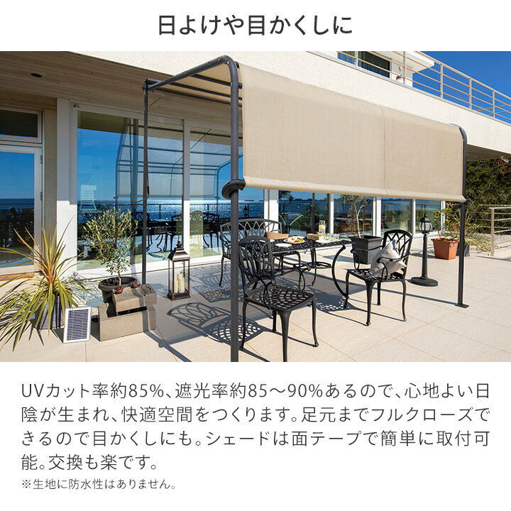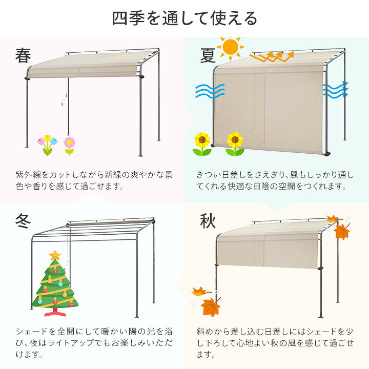 ■商品名:クールサマーオーニング ポーチ 3000 ■コード:51742800 ブラッシュウッド ■コード:51743500 アーバングレー フルオープンからフルクローズまで、無段階でシェードの開閉ができます。 ハンドルをクルクル回すだけで、必要な長さのシェードを出したり、しまったりできる簡単操作。 日差し対策はもちろん、前面をシェードで覆えば、目かくしとしても。 庭に心地よい日陰をつくるだけでなく、フォーカルポイントとしてもお使いいただけます。 安心の3年保証付き(生地のみ)。 商品情報 サイズ 約幅310cm×奥行255cm×高さ270cm 間口:[正面]約幅289×高さ185.5cm[側面]約幅238.5×高さ(前)200(後)256cm[背面]約幅289×高さ256cm 重量 約63kg 材質 構造部材:スチール(表面処理/ポリエステル樹脂粉体塗装)生地:ポリエチレン 備考 組立品UVカット率:約85%遮光率:約85~90%品質保証:3年※生地のみ マンション〈2階以上〉のベランダ・屋上では使用しないでください。 ※1階のベランダではご使用いただけます 【関連ワード】オーニング、オーニング つっぱり、オーニング 取付金具、オーニングテント、オーニング 3m、オーニング 自立、つっぱり オーニング 3m、ひよけ オーニング 3m、オーニング 自立式、オーニングテント 3m、オーニングテント 手動、突っ張り オーニング 2m、オーニング 金具、庭 日除け オーニング、シェード オーニング、日よけ シェード オーニング、撥水 シェード オーニング、オーニング タカショー、日よけ オーニング、日除け オーニング、ベランダ オーニング重量 材質 備考 約63kg 構造部材:スチール(表面処理/ポリエステル樹脂粉体塗装)生地:ポリエチレン 組立品UVカット率:約85%遮光率:約85~90%品質保証:3年※生地のみ ご確認ください あらかじめ設置場所を決めてください。 -固定場所のポイント…設置に必要なスペースがある場所、十分な強度がある場所 設置場所に応じた固定方法 梱包サイズ 窓の枚数や空間の広さに合わせて選べる2サイズ 1坪のデッキが納まる2000タイプ(間口189cm)と 1.5坪のデッキが納まる3000タイプ(間口289cm)があります クールサマーオーニング ポーチ 2000 クールサマーオーニング ポーチ 3000 雨よけもしたい場合は 撥水仕様の 「クールサマーオーニング ポーチ ウォーターガードベージュ 3000」をご使用ください。 クールサマーオーニング ポーチ ウォーターガードベージュ 3000 交換用シェード クールサマーオーニング ポーチ用シェード 3000 クールサマーオーニング ポーチ用シェード ウォーターガードベージュ 3000 横からの目かくしや西日対策に オプションとしてサイドシェード(別売)がございます。 中央にはファスナーがあり、出入りも自由です。 クールサマーオーニング ポーチ用サイドシェード 3000 クールサマーオーニング ポーチ用サイドシェード ウォーターガードベージュ 3000 型番:CSA-P30BR3 CSA-P30U3このページは販売期間の設定がされています販売期間前にご注文を希望される方は↓よりご注文くださいいますぐ注文する>>
