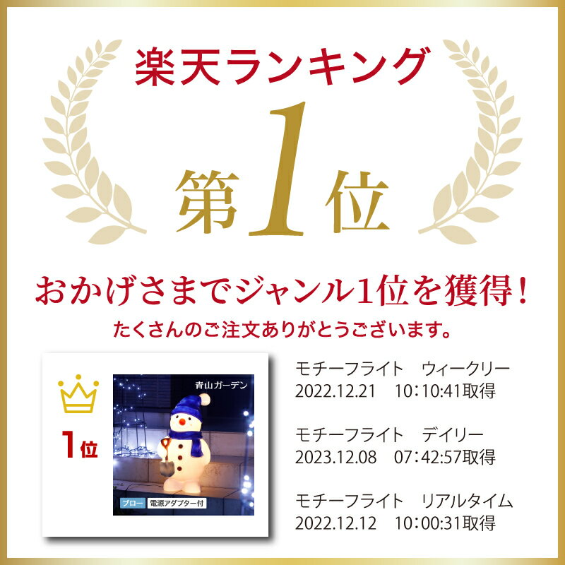 ■商品名:ブローライト スノーマン ■コード:72615800 商品情報 サイズ 約幅31×奥行26×高さ58cm 重量 約1.5kg 材質 ポリスチレン・塩化ビニル樹脂 使用環境 屋外 延長コード 約5m LED 36球(シャンパンゴールド) 最大ワット数 6W 消費電力 約3W※本体のみ 備考 8ファンクション当社2in1シリーズの商品に限り 付属の専用コントローラー(LIT-06)で4.2Wまで連結が可能です。 別売の専用コントローラー(LIT-35)で24.5Wまで連結が可能です。 注意事項 ブローライトは発売時期によって種類が異なっており、AC(直流)24V仕様の旧タイプと2in1仕様の本商品では連結が出来ません。連結を希望される際はお手元の商品の規格が「DC(直流)24V」であることを ご確認下さい。 関連ワード:イルミネーション イルミネーション 屋外 イルミネーション 屋外 イルミネーション スノーマンスノーマンがやさしい笑顔でお出迎え 寒さを忘れるあたたかいイメージの3Dモチーフライトブローライト スノーマンモチーフスノーマン2in1ローボルト屋外OK簡単設置【45秒でご紹介しています】玄関やお庭を飾る冬の可愛い人気者 「スノーマン」がずっとあなたのそばで見守ってくれている、 そんな優しい光に癒されるモチーフライトです。 お庭や玄関先に設置するのに丁度いい大きさ。 置くだけで手軽に可愛いイルミネーションが楽しめます。 ※イメージは、「ブローライト スノーマン 赤」になります。 あたたかみあふれる光の輝きで、ロマンチックな夜を コードをつないで置くだけなので、届いてすぐに立体のかわいいイルミネーションが楽しめます。 冬の間ずっと飾っていられるデザインです。並べても可愛い ライトを点灯をしてない昼間には可愛いオブジェに。 スノーマン「赤」と一緒に飾るのもおすすめです。スノーマン「赤」はこちら点灯イメージ点灯時消灯時他のモチーフと組み合わせてみても一つでも十分楽しめますが、他の色んなデザインを一緒にアレンジして組み合わせると まるで物語のワンシーンが映し出されているようで、見ているだけで楽しくなる風景を演出できます。 省エネ&安全設計LED電球使用LED電球を使用で省電力。電気代を抑えられます。ローボルトへ電圧変換100Vから24Vへ電圧変換します。ローボルトで漏電や感電など万が一の時でも安心です。使用方法についてサイズについてサイズ重量材質備考約幅31×奥行26×高さ58cm約1.5kgポリスチレン・塩化ビニル樹脂使用環境:屋外、延長コード:約5m、LED:36球(シャンパンゴールド)、最大ワット数:6W、消費電力:約3W※本体のみ、8ファンクション 当社2in1シリーズの商品に限り 付属の専用コントローラー(LIT-06)で4.2Wまで連結が可能です。別売の専用コントローラー(LIT-35)で24.5Wまで連結が可能です。付属商品2in1専用コントローラー付属商品2in1ブロー専用延長コード5m専用のコントローラー(別売)を使って連結24.5Wまで連結が可能なコントローラーはこちら組み合わせ可能なアイテム(別売)2in1ブロー専用 延長コード 5m2in1ブローライト専用3分岐コードブローシリーズに使えるアクセサリーはこちらご理解くださいLEDなど電子部品の性質上、光の色にバラツキがあります。同じ商品でもロットや製造年によって色味が異なりますが、不良品ではございません。メーカー直送品の為、色味をそろえての出荷はできません。上記の理由による返品・交換はできません。 予めご了承の上、ご注文をお願い致します。カラーバリエーションスノーマン本商品の 販売ページですスノーマン赤型番:LIT-BL03L