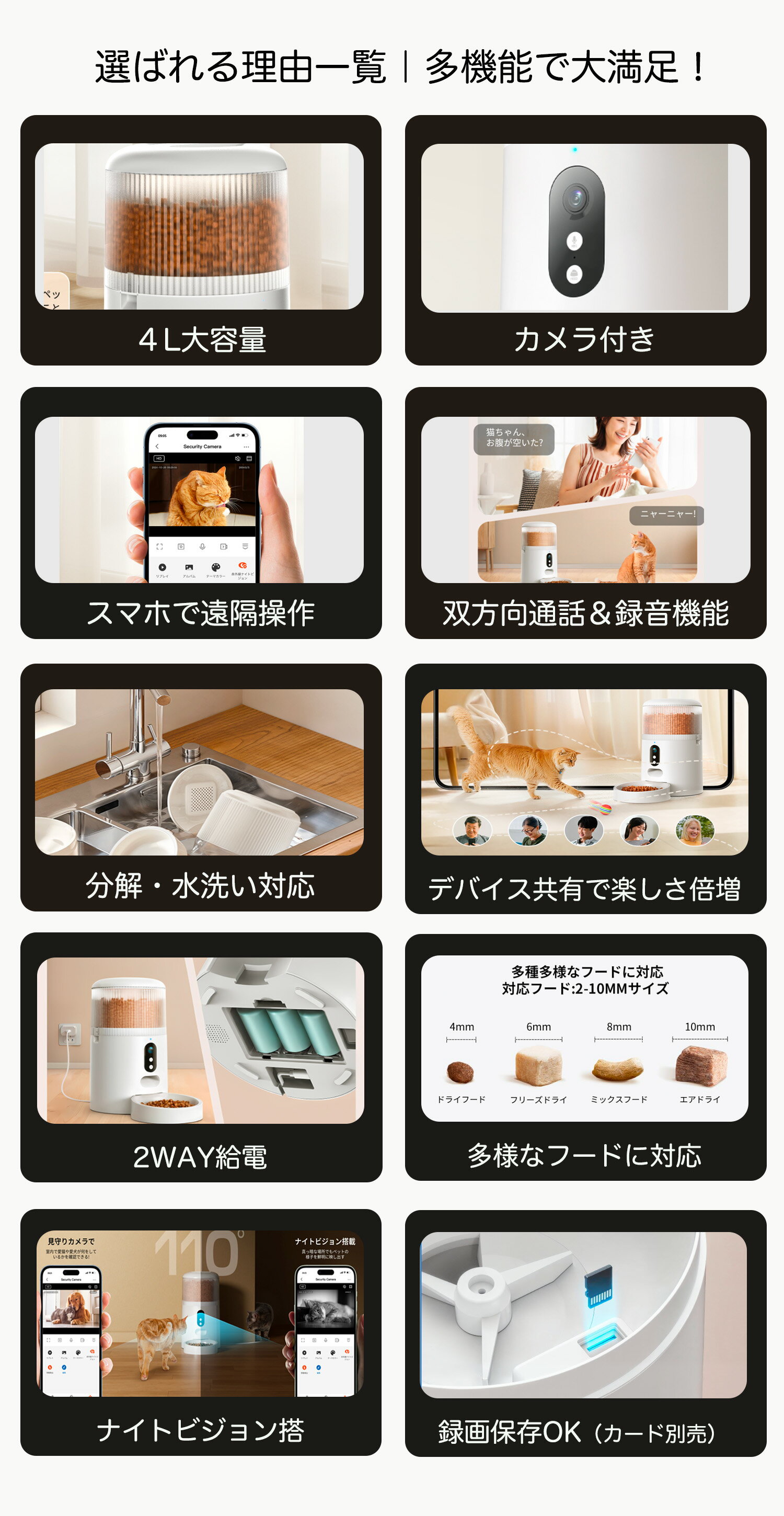 自動給餌器 猫 犬 4L スマホ遠隔操作 見守りカメラ付き 自動餌やり機 ペット給餌機 タイマー機能 音声録音 1日8食 定時定量 大容量 透明タンク 手動操作可 清潔便利 乾燥剤対応 2WAY給電 日本語説明書付き