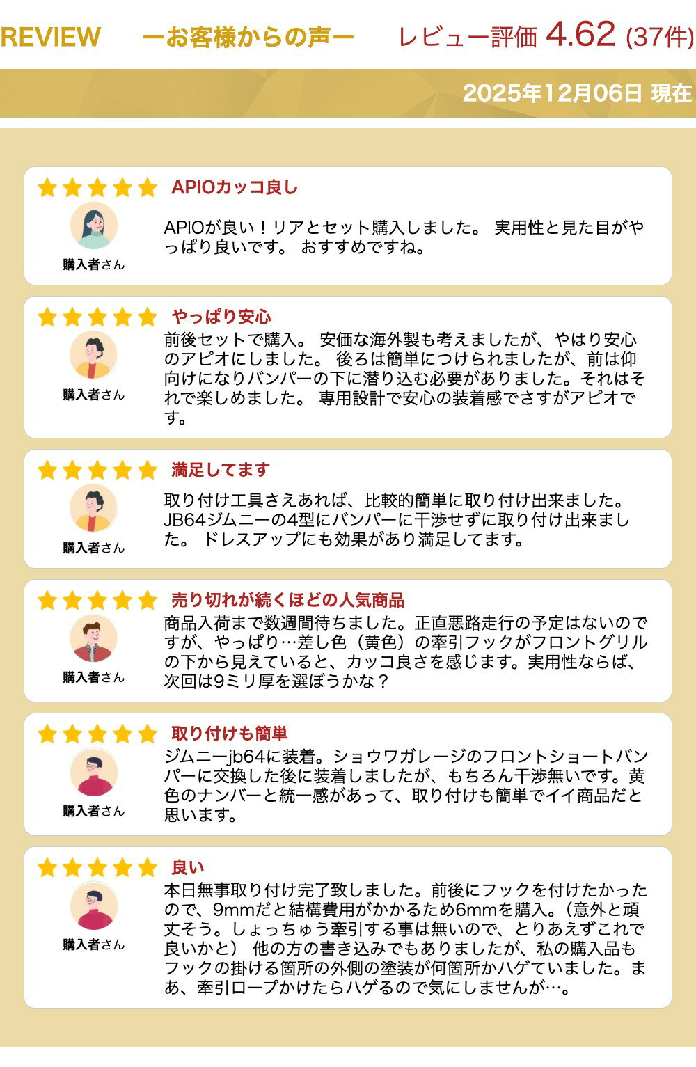 2024年11月1日 価格改定 FRONT TOW HOOK for JIMNY JB64 & JIMNY SIERRA JB74 [ 製品説明 ] フロント牽引フック・6mm厚 適 合:JB64,JB74の純正バンパーに対応 本体材質:6mm厚スチール製 本体塗装:イエロー 補強プレート材質:4mm厚スチール製 補強プレート塗装:ブラックカチオン 重 量:およそ2.8kg(ボルト類含む) 取 付:ボルトオン装着(穴空け不要) 取付箇所:フロント左(助手席側) 付属品:牽引フック本体・補強プレート・取付用ボルトナット類 車 検:車検対応品 製造国:日本製(Made in Japan) ※JB64/74 5型の車両への装着には一部干渉する部分の削りまたはカットによる加工が必要となります。 ジムニーJB64,ジムニーシエラJB74の純正バンパーに対応した6mm厚の牽引フック。 取付箇所はフロント左(助手席側)となります。運転席側の設定はございません。 純正バンパーの場合に純正フックが中に入りすぎて使いづらいというお声にお応えして、いざという時に使いやすいフックポイントになる様に設計されています。更に、目立つイエローペイントで泥の中、雪の中でもフックポイントを発見しやすくなります。 純正フックを挟み込む様に取り付けするサンドイッチ構造はとても簡単なボルトオン装着です。 挟み込む際に純正フックとの隙間を極力減らす様にフック本体と補強プレート裏には段差を埋めるブロックが溶接済み。隙間を減らすことで強度をアップさせています。 [ 使用上の注意 ] ・当商品は純正同等の車両への装着を想定しております。弊社デモカーでは純正バンパー車両にタイヤサイズは185/85R16までを装着しておりま。それ以上に幅の太いタイヤをお使いですとホイールインセットによってはハンドル据え切りでタイヤが干渉する場合があります。 ※ジムニーシエラJB74はホーシングが長いので干渉の心配はございません。 取付説明書は下記よりダウンロード可能です。(製品購入時にも付属します) ・[ PDFファイル ] フロント牽引フック 取付説明書 ジムニー jb64 パーツ関連商品ジムニー ジムニーシエラ パーツ 牽引フック【アピオ (TR9)クティ...ジムニー ジムニーシエラ パーツ 牽引フック【アピオ (TFL9)タク...ジムニー ジムニーシエラ パーツ 牽引フック【アピオ (TFR9) タ...13,200円23,650円23,650円ジムニー ジムニーシエラ パーツ 牽引フック【(SFR9) しし狩りバ...ジムニー ジムニーシエラ パーツ 牽引フック【アピオ (SFL9)しし...ジムニー パーツ 【アピオ ジムニー JB23 T9 牽引フック 穴空...24,640円24,640円11,000円ジムニー ジムニーシエラ カスタム パーツ【アピオ フューエルインナー...ジムニー ジムニーシエラ パーツ 牽引フック【純正バンパー用フロント左...ジムニー パーツ ペダル【アピオ アルミ MT ペダルセット】 ジムニ...15,400円24,750円14,630円ジムニー シエラ フットレスト【アピオ MTドライバーズフットレスト(...ジムニー パーツ 【アピオ ジムニー JB23 純正リアバンパー用 牽...アピオ ジムニー シエラ JB43【純正リアバンパー用 牽引フック 穴...15,400円14,080円14,080円スズキジムニーJB64,ジムニーシエラJB74 用パーツ続々リリース中! ジムニー jb64 パーツ