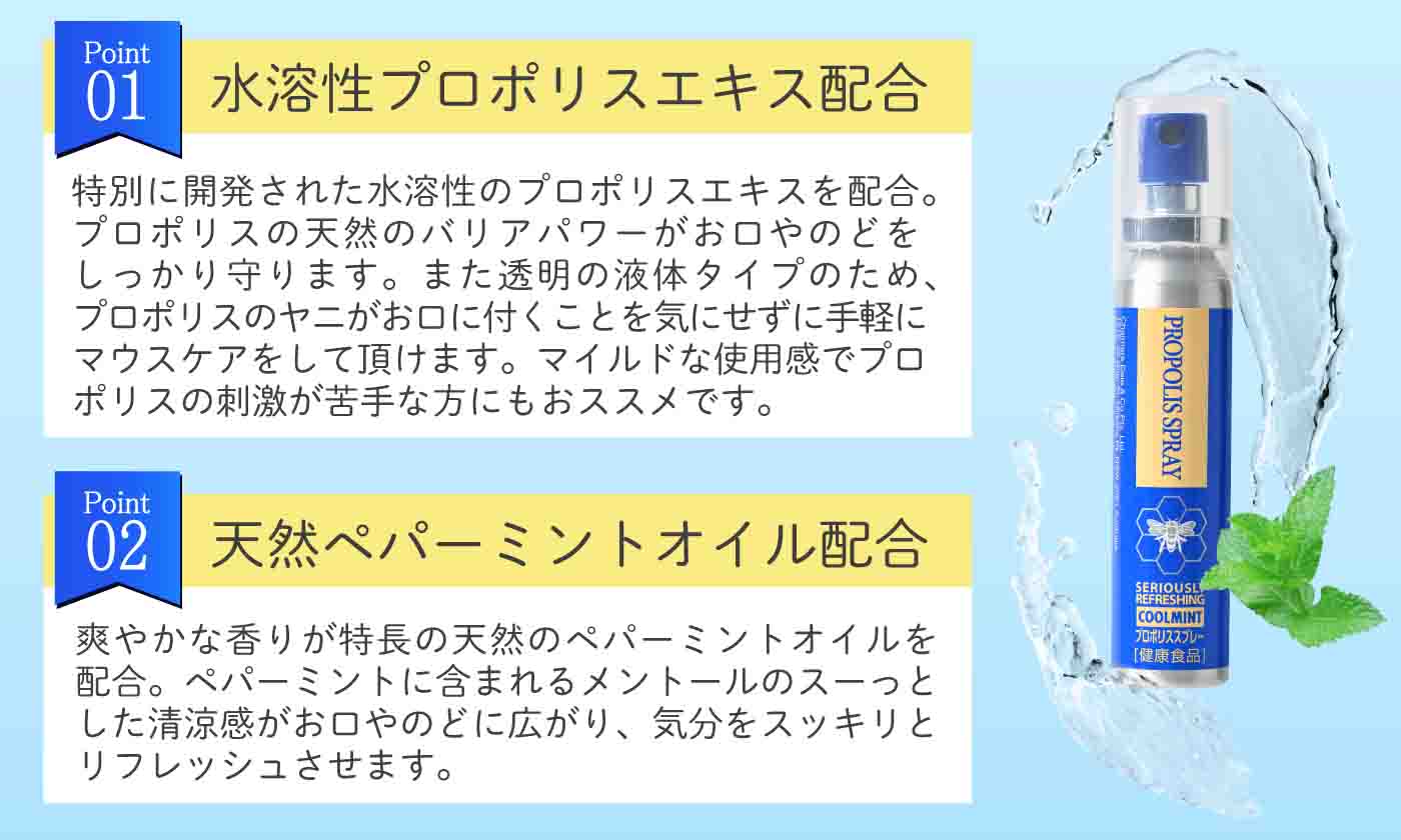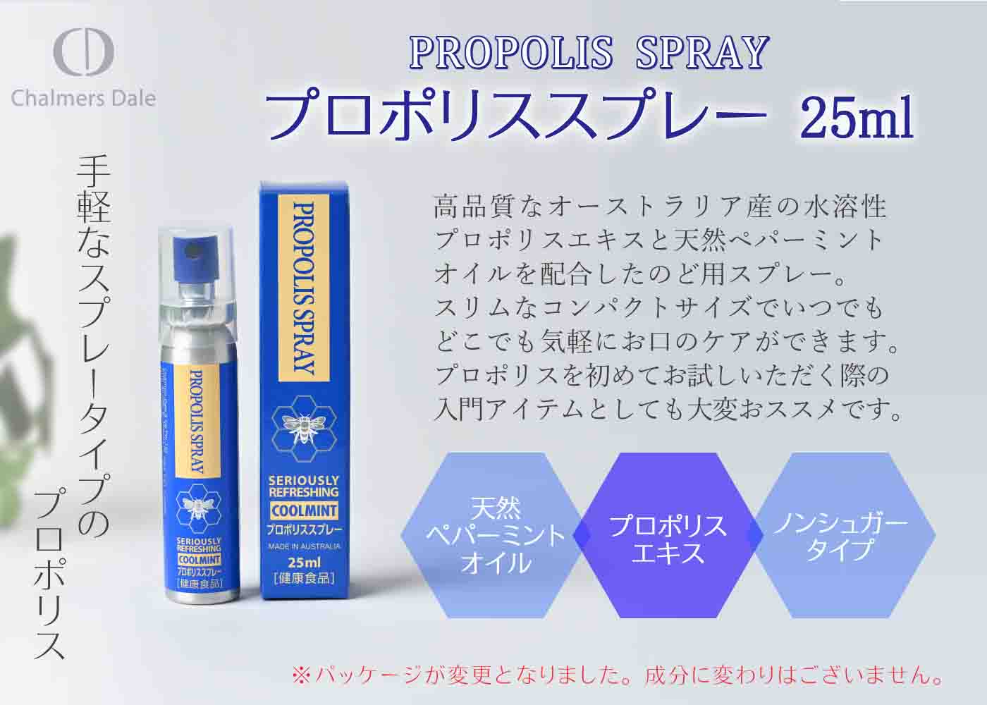内容量 25ml ★ご使用方法★ ◆1日5〜10プッシュを目安にお召し上がりください。 原材料 精製水・グリセリン・プロポリスエキス・ペパーミントオイル・クエン酸 製造国 オーストラリア 製造者 Chalmers Dale社 保存方法使用上の注意 ■直射日光を避けて保存して下さい。■お子様の手の届かない所で保管してください。 ■蜂アレルギーの方は飲用をお避けください。 商品区分 健康食品 広告文責社名・輸入者 株式会社アルファージャパン TEL:047-433-6631プロポリススプレー 25ml プロポリススプレー 25ml [シュガーレスタイプ] 水溶性プロポリスエキスとペパーミントオイル配合の清涼感あふれるのどスプレーです。 シュッと一吹きでお口の中をリフレッシュ!ポーチにも入るスリムなコンパクトサイズで外出先でも気軽にケアができます。 [ノンシュガータイプ] ※パッケージが変更となりました。 プロポリスって何? CD社プロポリス プロポリスは「蜂やに」と呼ばれ、ミツバチが巣を作る時に大切な巣を外部の雑菌や外敵から守る為、体液とユーカリ等の樹液や花粉を噛み砕き、自らの唾液に含まれる酵素を混ぜ合わせて巣穴に塗りつけて、そこから出される樹脂状の物質です。 CDブランドプロポリスは独自の精製技術で不純物を徹底除去した製品です。 こんなときに! ■持ち運びに便利なコンパクトサイズで、外出先でも手軽にマウスケア。 ■のどをよく使う方。 ■タバコを吸う方。 ■口臭が気になる方。 ■乾燥している時。