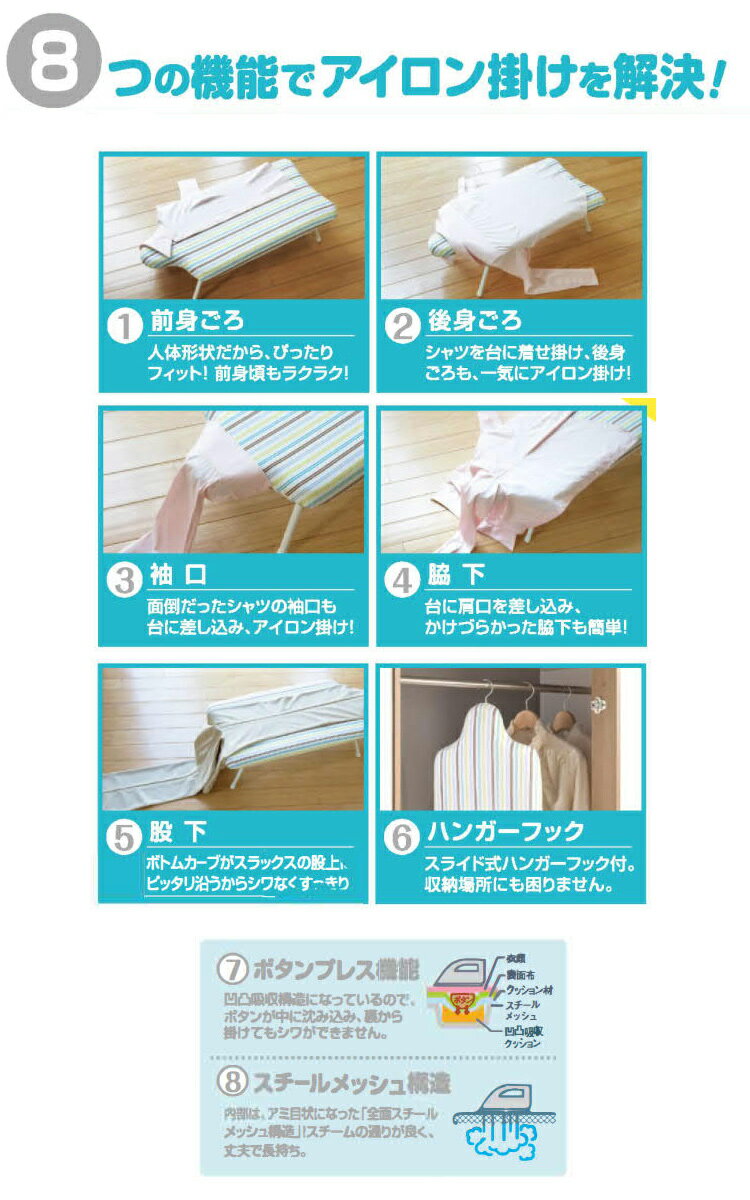 商品名 解決人体型 アイロン台 G-1 商品型番 7414 商品サイズ 約75x37x高さ23cm 商品重量(約) 2.1Kg 素材・材質 表面布=ポリエステル・綿 クッション材=ポリエステル 天板・脚部=スチール(粉体塗装) フック=スチール(ユニクロメッキ) ボタンプレスゾーン=凸凹吸収クッション・ポリウレタンフォーム 原産国 中国 備考 足部分折り畳み収納可能 JAN 4903208074148 説明 天板は熱に強く丈夫なスチールメッシュ製。 アイロンのスチームが通りやすく、仕上がりが良くなります。 人体型の首の部分を使ってシャツの袖口のアイロン掛けも簡単に。 新開発のボトムカーブ機能を搭載、ズボンの股上に沿うように台にカーブが付いています。 ボタンプレス機能凹凸吸収構造になっているので、ボタンが中に沈み込み、裏から掛けてもシワができません。 スライド式のフックが付いているため、クローゼットなどのパイプに引っかけて収納可能。■ 解決人体型 アイロン台 G-1 (7414)