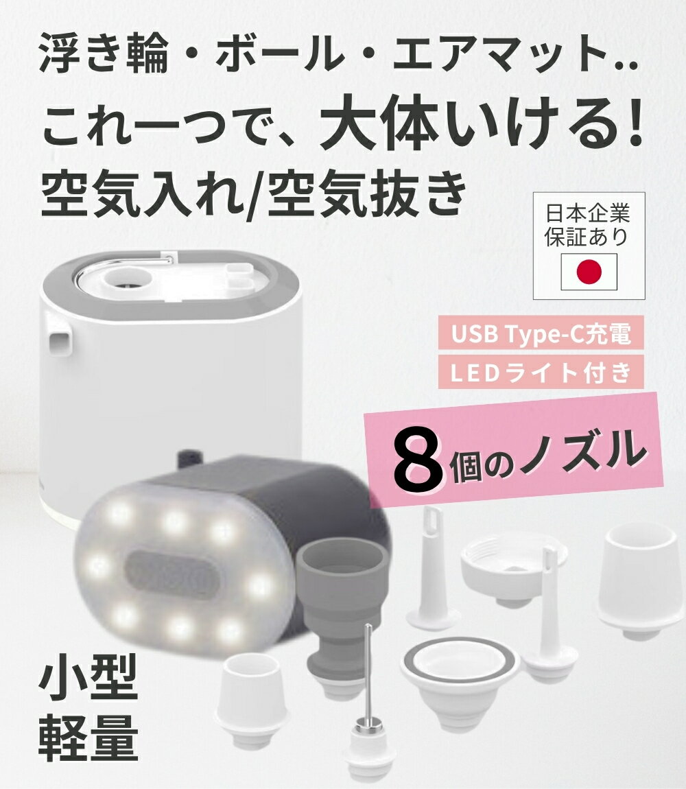 ★一部、日本語説明書の入れ忘れがございました。 付属していない場合は、ご連絡ください。PDF日本語説明書をお送りします。 浮き輪 プール ボール 電動 エアポンプ 空気入れ 空気抜き ノズル8種 小型 軽量 コンパクト 1360mAh USB 充電式 TypeC コードレス LEDライト付き 電動ポンプ エアーポンプ エアマット エアベッド 子供プール プール用 キャンプ アウトドア USB充電 収納ポーチ付き 日本企業 保証あり 商品レビューのご記入で、レビュー延長特典あり ・8個のノズル付属で、これ一つでプールもキャンプも対応(浮き輪、プール、エアマット、インフレーターマット、ボール etc.) ・空気入れと空気抜きができる ・小さくて軽いので持ち運びに負担なし ・選べるハイパワータイプ/ローパワー ・空気抜きもハイパワー ・操作がカンタン(お子さんが一人で使えるくらい) ・LEDライト機能付き(白昼色、電球色) ・モバイルバッテリー機能付 ・日本企業保証付き★一部、日本語説明書の入れ忘れがございました。 付属していない場合は、ご連絡ください。PDF日本語説明書をお送りします。