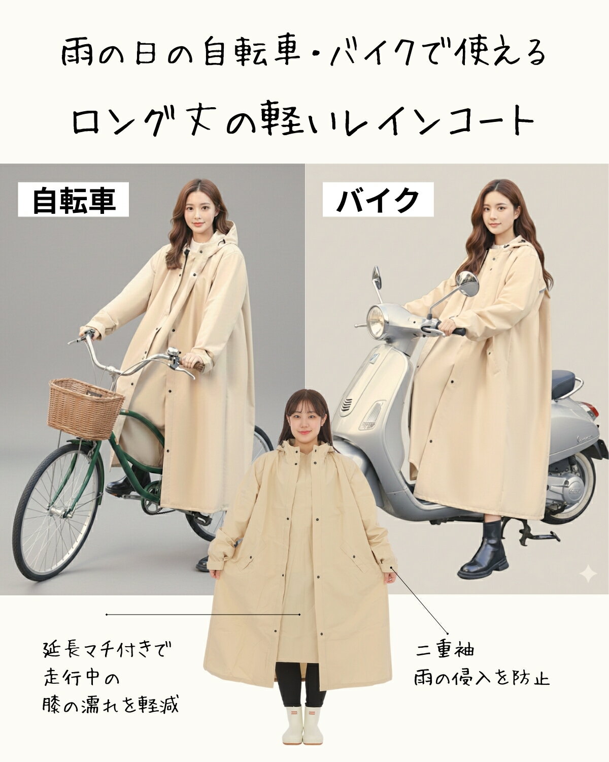 レインコート レディース メンズ 男女兼用 自転車 バイク 原付 リュック 背負ったまま 通学 通勤 保育園 送迎 ママ 高校生 野外フェス ロング丈 ロング 長め ヘルメット対応 顔カバー ポケット付き 反射テープ 収納バッグ付き 説明書付き カッパ かっぱ きれいめ 可愛い かわいい おしゃれ 軽量 つば付き ツバ付き バイザー 自転車用 ビジネス 「送料無料」 【自転車・バイクに】膝下までカバーするロング丈でバイク、原付き運転に適したレインコートです。(膝から下は、レインブーツを履きましょう。)自転車やバイクに跨った際の、両膝の間の隙間を生地拡張したマチでカバーできます。 【リュックを背負ったまま】幅広設計で、リュックを背負ったままコートを羽織れ、通勤・通学に使えます。 【レインバイザー付き】付属のバイザーをレインコートのフードにマジックテープで着脱可能。透明の二重ツバがクリアな視界を確保しながら、雨から顔をガードし、化粧崩れを防ぎます。 【バイザーフィルムはがし】バイザーは表面にフィルムが付いています。端をカッターなどで軽く切ることでキレイにカットできます。少し面倒ですが、傷をつかない状態でお届けするためです。何卒ご了承ください。フードの絞め具合、後頭部の張り具合を調整でき、バイザー装着後、程よく合わせます。 【ファスナーとボタンの二重設計】ファスナーを閉じてボタンを留めることで、隙間を無くし、雨水や風の侵入をしっかり防ぎます。 【収納袋付き】雨の日に着た後のレインコートをサッと収納しておくことができます。 【ポケット付き】※ポケットのボタンは飾りです。ボタンとしての機能はないです。 【袖口カバー】袖口は、中に口ゴムが付いた二重袖設計。手首の濡れを防ぎます。 【軽量設計】「レインコートって重い」そのイメージを覆す軽さで、気軽に使えます。背中にメッシュの通気口を設置し、通気性を確保しています。野外フェス、スポーツ観戦、アウトドアにも。 【サイズ選びご注意】元々、ロング丈で、幅のある作りです。普段のサイズより大きめサイズを選ぶと、大きすぎるのでご注意ください。画像をご参考ください。