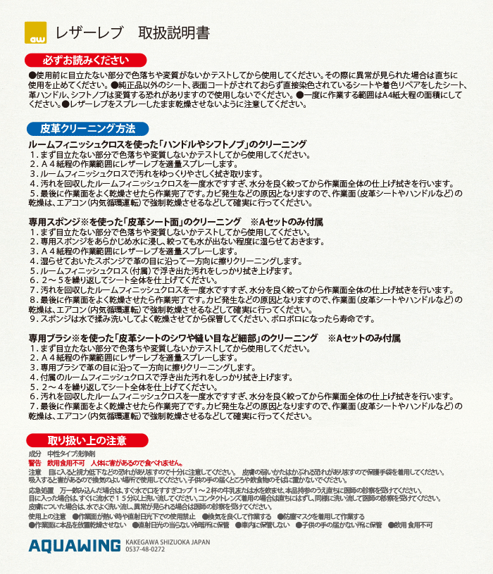 製品データ 用途:皮革製品の汚れやテカリの除去 成分:中性タイプ特殊洗浄剤 容量:300ml 約7.5席分(普通車約1台分) 液色:透明 内容:レザーレブ本剤300ml スポンジ×2 ブラシ×1 ルームフィニッシュクロス×1 取扱説明書 適応:皮革シート◎ 皮革ハンドル(純正品)〇 皮革ハンドル(社外品)△ リペアされた皮革シート× 直接染色タイプの皮革シート× 備考:仕上げ剤にはレザーケアバームをオススメします 関連商品:レザーレブ300ml Aセット レザーレブ300ml Bセット 詰替パック500ml 詰替パック1000ml(1リットル) 詰替パック3000ml(3リットル) 注意事項 ●本品は一昔前の直接染色タイプの皮革シートには使用しないでください。心配な場合はお気軽にご相談ください。 ●レザーレブはセット付属のスポンジ・ブラシ・クロスを使った施工方法でおねがいします。他の方法で施工した場合、本来のパフォーマンスは発揮されません。いろいろ試しても効果が無かった方にこそ 使ってほしい レザーレブは今までの、謳い文句ばかりで全然効果が無いレザークリーナーとは違います!各画像やお客様のレビューを見ていただければ解かっていただけると思います。今まで色んなクリーナーを試しても、大した効果も得られずガッカリしていた方には是非使っていただきたい皮革クリーナーです。 効果が違う 実力抜群の皮革クリーナー レザーレブは皮革シートの油分やスレによりできるテカリや汚れをキレイに除去し、皮革本来のしっとりとした状態に戻すクリーニング施工セットです。本品をシートに軽くスプレーし湿らせた専用スポンジ&ブラシで一方向に擦り、浮き出た汚れや油分を乾いたタオルで拭き上げるだけです。施工後は、まるで新品の様にキレイに仕上がります。 仕上げにはレザーケアバームがオススメです。 クチコミで販売数 10,000セット突破 おかげさまで、レザーレブの販売を開始してから販売数が10,000セットを突破いたしました。 これはレザーレブが本当に優れたクリーナーだという証だと思います。購入時には、他のお客様のレビュー等も参考にしていただけると幸いです。また、当店ではこの販売実績を生かして様々な素材へのマッチングの相談も受付けておりますので、お持ちの皮革パーツへの適合等、良く分からない場合は遠慮なくご相談ください。 レザーレブは安全な中性タイプ 各色の皮革シートに対応 レザーレブは中性タイプの特種洗浄剤を使用した安全なクリーナーです。皮革に対して有害な成分は含みませんから、使用後に皮革の表面が荒れたり変質するようなことがございません。安心してご使用ください。 テカリが目立つブラック、黒ずみ汚れが目立つベージュやホワイト、様々な皮革シートをお使いのお客様にも同等の評価を得ております。 ※但し、最近ではあまり見られなりましたが表面コートの無い直接染色タイプ皮革シートや社外ハンドルには本品を使用しないようご注意ください。心配な方は事前にご相談いただくか、使用前に目立たない部分で試して異常がないか確認のうえご使用ください。