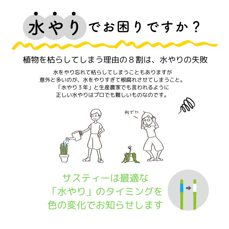 商品情報サスティー Mサイズ 個包装1本入×2水分チェッカー 水が足りているリトマスが緑に水分が不足しているとリトマスが白に※使用期限:水やりをしても色が変わらなくなったとき土壌PH(濃度)により、使用期限は異なります。直径18センチぐらいまでの鉢用 観葉植物 鉢物観葉植物コチョウラン バラ ハーブ 多肉植物 鉢花 など片手で持てる鉢用 個別包装タイプ 水分計 水分チェッカー 水やりチェッカーサスティー Mサイズ 2本 グリーン ホワイト ブラック 5〜6号鉢用 新色ブラック発売開始! 水分チェッカー サスティーのご使用方法 適切な水やりタイミングを「色の変化」でお知らせ。電池を使わないから、鉢に挿しておくだけ。 1