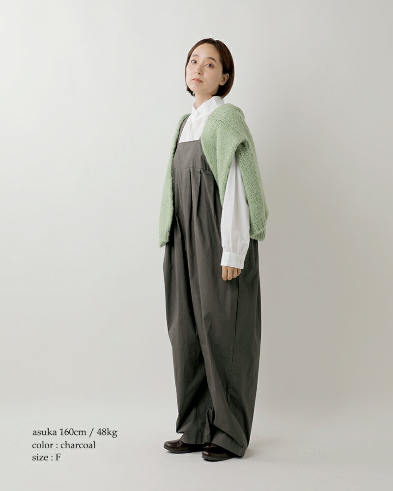 メーカー希望小売価格はメーカー商品タグに基づいて掲載しています 商品カテゴリー【ブラック】【グレー】【ベージュ】DIARIES(ダイアリーズ)馬布コットンタックサロペットパンツr62515 DIARIES(ダイアリーズ) Diary【日記】の複数形日々の出来事の複数形日々の重なりのなかにある美しさを感じる余裕や、価値観をしなやかにとらえる思考。シンプルで品のある大人の佇まいを表現した、日本製のアイテムが揃います。 DIARIES 一覧はこちら 丈夫さとしなやかさを併せ持つ、 日常に寄り添うサロペット。 丈夫さと、しなやかで肌触りの良い生地で仕立てたサロペットパンツ。 高密度で耐久性がありながらも、ごわつきが少なくしなやかで軽い着心地が特徴のコットン生地を使用。 ゆったりとしたシルエットの中に、計算されたタックデザインが縦のラインを強調し、すっきりとした印象に仕上げています。 インナー次第で様々な表情をお楽しみ頂けます。 陰影が映える、 上品なタックデザインv ゆったりとしたシルエットの中に、計算されたタックを施した立体的なデザイン。 縦のラインを強調し、リラックス感がありながらもすっきりと見えるバランスに仕上げています。 裾をロールアップすると抜け感のあるこなれたスタイルに◎ 肩紐には3つのボタンホールがあり、好みや身長に合わせて長さの調整が可能。 さりげない仕様ながら、着こなしの幅を広げてくれる実用的なポイントです。 ●フロントにタック入りで立体感のあるシルエットに。 ●肩紐に3段階ボタンホールがあり、長さの調整が可能。 ●ウェスト右側にポケットが配されています。 ●左脇下のファスナーで着脱可能。 強さの中に、やさしさを 馬布コットンの心地よさ 高密度に織り上げた馬布(ばふ)コットンを使用。 もともと馬具の布として使われていた素材で、耐久性の高さと軽くしなやかな風合いが特徴です。 ごわつきが少なく、肌あたりの良い着心地を実現。 ※ワンウォッシュ仕上げにより、自然な風合いと柔らかさを引き出しています。 SIZE size(cm) 身幅 肩幅 袖口 ウエスト ヒップ ワタリ F 51 29.5 30.5 130 150 96 前股上 股下 裾幅 総丈 51 62 30 136 → サイズガイドはこちら country: 日本製 fabric: 綿100% info: 裏地/なし、伸縮性/なし、透け感/なし laundry: お洗濯について: 中性洗剤を使用してください。アイロンはあて布を使用してください。洗濯の際は、色落ちすることがありますので、他の物と分けて洗ってください。長時間の浸漬や濡れたままの放置はお避けください。 → 洗濯表示について