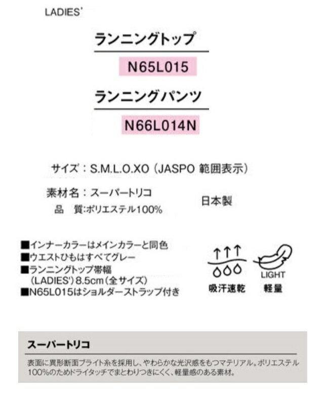 ランニングトップ LADIES ☆表面に異形断面ブライト糸を採用し、やわらかな光沢感をもつ素材「スーパートリコ」採用 ☆ポリエステル100%のため、軽量感がありドライタッチでまとわりつきにくい ☆伝統的な帯デザインが特徴的な、チームウエアとしてもそろえやすいベーシックなランニングシャツ ●素材:スーパートリコ(ポリエステル100%) ※ホワイトは濡れた際、透ける場合があります 【取寄せ品】 ※在庫状況は常に変動しております ご注文受付後に欠品、完売の場合もございますので予めご了承ください