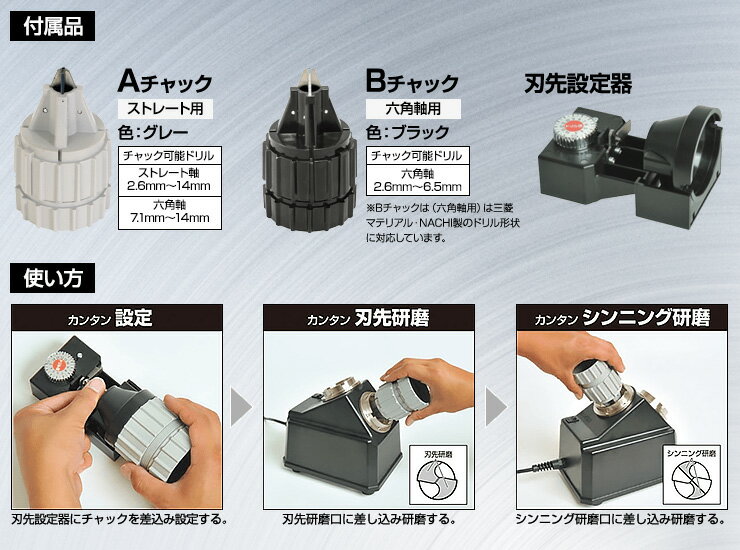 鉄工ドリル研磨機で新品の切れ味!鉄工用ストレートドリルと六角軸鉄工用ドリルに対応特徴操作が簡単!チャックを研磨機本体に差し込むだけです。※但し、手研ぎによる変形したドリルは修正時間が必要精度が高い!刃先角118度が正確に研磨逃角度:10度シニング形状:X形状研磨可能ドリルの種類・ハイス(HSS)ドリル・チタンコーティングハイスドリル・コバルトハイスドリル正確な穴が開きます。低価格!低価格で高品質。砥石1個で200回以上研磨できます。2つのチャックで用途が倍増!Aチャック(鉄工用ストレートドリル2.6~14mm対応・六角軸鉄工ドリル7.1~14mm)Bチャック(六角軸鉄工ドリル2.6~14mm対応)研磨の効果良く切れます。折れが少なくなります。再研磨で繰り返し使えます。経費節減に役立ちます。メーカーからの取寄せ商品のため、ご注文後のキャンセル、返品、交換はできません。万一、メーカーでの欠品や廃番により商品をご用意できない場合はご連絡いたします。メーカーからの取寄せ商品のため、お客様都合によるご注文後のキャンセル、返品、交換はできません。受注後にメーカー在庫を確認いたします。万一、メーカーにて欠品や廃番の場合は商品をご用意できない場合がございます。その場合は、メールにてご連絡させて頂きますので、ご注文後、当店から届くメールを必ずご確認宜しくお願い致します。ご注文はキャンセルさせて頂くことがございますので、予めご了承お願い致します。