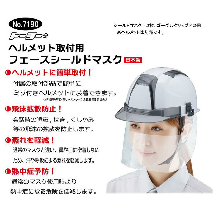 シールドマスク2枚、ゴーグルクリップ2個、※ヘルメットは別売りです。付属の取付部品で簡単にトーヨーセフティーのミゾ付きヘルメットに装着できます。MP型等のミゾなしヘルメットには装着出来ません。飛沫拡散防止会話時の唾液、せき、くしゃみ等の飛沫の拡散を防止します。蒸れを軽減通常マスクと違い、鼻や口に密着しない為、汗や呼吸による蒸れを軽減します。熱中症予防通常のマスク使用時より熱中症になる危険を低減します。メーカーからの取寄せ商品のため、お客様都合によるご注文後のキャンセル、返品、交換はできません。受注後にメーカー在庫を確認いたします。万一、メーカーにて欠品や廃番の場合は商品をご用意できない場合がございます。その場合は、メールにてご連絡させて頂きますので、ご注文後、当店から届くメールを必ずご確認宜しくお願い致します。ご注文はキャンセルさせて頂くことがございますので、予めご了承お願い致します。