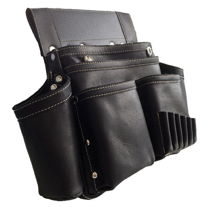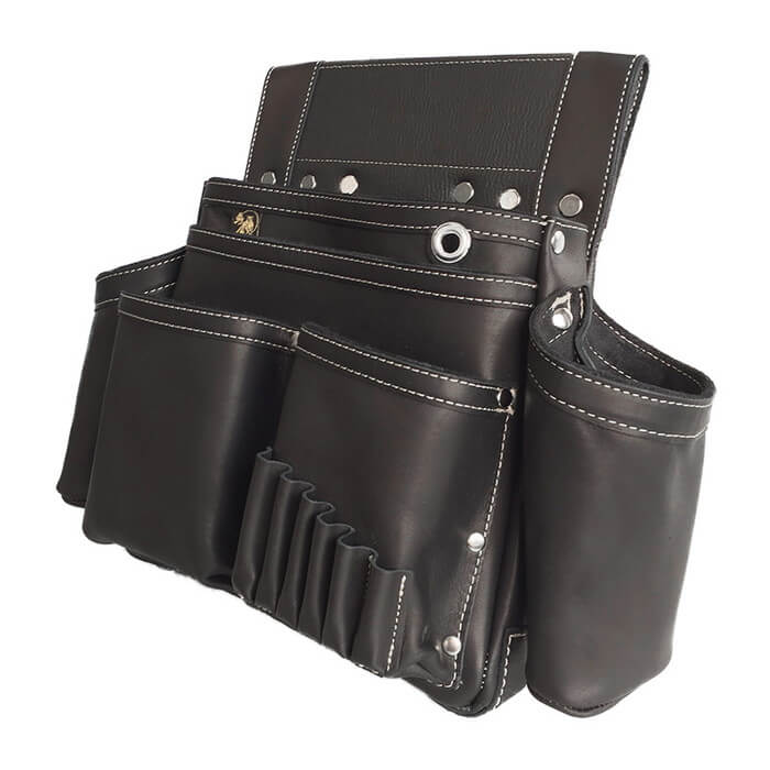 【特徴】表面の仕上げ処理(樹脂系塗料や型押し)をしない、いわゆる「素上げ」によるグローブ革を使用。つやを抑えた革本来の風格ある仕上がりです。柔らかさの中にもハリとコシのある部分を使用しています。使用やオイルアップなどのメンテナンス次第では何とも言えない味が出てきます。前部分は材料は兵庫県たつの産グローブ革(牛革)背面部分は耐久性のある2枚張り人工皮革。製材から縫製まで兵庫県たつの市の工場で一貫生産しています。すみつぼホルダーを左右に1個ずつ配置したWすみつぼタイプ。【仕様】素材:牛革製(釘袋前面とすみつぼホルダー部分)、人工皮革(裏面)日本製サイズ:約 W 250 × H 330(H 250) × D 50 mmW 横巾 × H 縦全長 (H 1段目ポケットの深さ) × マチ mmW 横巾 はすみつぼホルダーやのみ差しを含まない本体部分の巾です。H 縦全長はベルト通し部分を含む 全体の長さです。1段目ポケットとは釘袋を正面から見て一番奥の収納部分をさします。マチは1段目ポケット部分のマチ幅です。手作りの為、多少の誤差はご容赦ください。サイズなど分かりにくい場合はご注文前にお問い合わせください。
