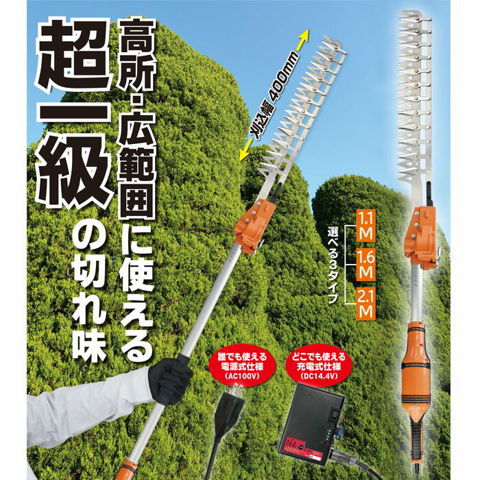 【特長】手軽に使える電源式(AC100V 240W)●ハサミ式で刈幅400mmを実現!12枚刃で広範囲の刈込み作業が格段にはかどります。●驚異の切れ味パワーモーター搭載で約15mmまでの生木が軽く切断できます。ハサミ式駆動と三面研磨処理により切断面もキレイで樹木を傷めません。●刈刃角度可変式上向き・下向きそれぞれ30度まで角度変更が可能。最適な角度で刈り込みがができます。●高耐久の電源コード耐久性がアップした電源コード。使用時の折れや内部断線を防ぎ、接続部分を保護するカバー付きです。【仕様】電源式 AC100V 240W保護機能(ブレーカー)搭載2.1mタイプ本体寸法:2120×100×80mm本体質量:約2.4kg原産国:日本【材質】刃:高級刃物鋼本体:ナイロンパイプ:アルミ合金メーカーからの取寄せ商品のため、お客様都合によるご注文後のキャンセル、返品、交換はできません。受注後にメーカー在庫を確認いたします。万一、メーカーにて欠品や廃番の場合は商品をご用意できない場合がございます。その場合は、メールにてご連絡させて頂きますので、ご注文後、当店から届くメールを必ずご確認宜しくお願い致します。ご注文はキャンセルさせて頂くことがございますので、予めご了承お願い致します。