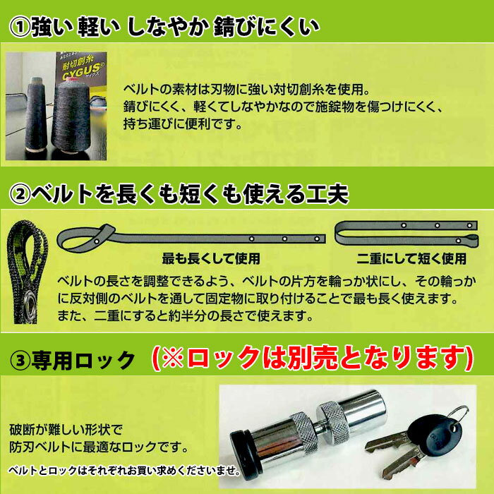 【特長】自転車の地球ロックや、スキー板、ボードの持ち去り防止に!強い・軽い・しなやか・錆びにくい新素材ベルトが大切なアイテムを守ります。ベルトの素材は刃物に強い対切創糸を使用。錆びにくく、軽くてしなやかなので施錠物を傷つけにくく持ち運びに便利です。ベルトが長いときは輪とハトメで長さを調整して使用できます。別売の専用ロックを取り付けて使用できます。専用ロックは破断が難しい形状の強力ロックです。【仕様】ベルトの重さ:約75gベルト長さ:約1.5mベルト幅:約30mmベルト厚み:約1.5mm(ハトメ部分 約4mm)ハトメ内径:約9mm【素材】ベルト:耐切創糸 CYGUS(R) (サイグス )ハトメ:真鍮、端末金具ワイヤー:ステンレス【注意】本製品はベルト部分のみとなります。鍵は付いていません。別売の専用ロック(CU-011)とのご利用をおすすめします。メーカーからの取寄せ商品のため、お客様都合によるご注文後のキャンセル、返品、交換はできません。受注後にメーカー在庫を確認いたします。万一、メーカーにて欠品や廃番の場合は商品をご用意できない場合がございます。その場合は、メールにてご連絡させて頂きますので、ご注文後、当店から届くメールを必ずご確認宜しくお願い致します。ご注文はキャンセルさせて頂くことがございますので、予めご了承お願い致します。