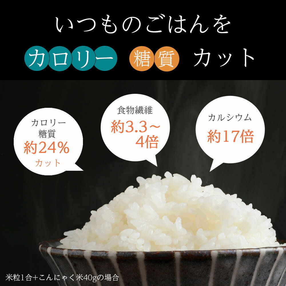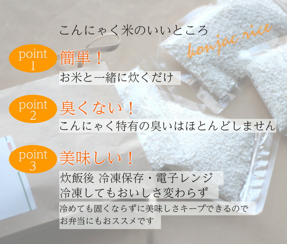賞味期限:2026年7月18日 こんにゃくを粒状に加工し乾燥させた「乾燥こんにゃく」です。 原料は、においの少ないインドネシア産こんにゃく。 お米と一緒に、混ぜて炊くだけでカロリーオフごはんに! 主食のごはんをカロリー約24%カットするダイエット、糖質が気になる方の強い味方。 炊いたごはんは冷凍保存OK、もちろんピラフや雑炊などいろいろなお料理にも。 こんにゃく米の炊き方 1、洗ったお米1合とアレスの乾燥こんにゃく米1袋(40g)を炊飯器にいれ、水を炊飯器1.5~1.8合の目盛りまで入れる(お好みにより水加減を調整してください) 2、1時間程度浸水して、通常通り炊飯する 3、炊き上がり後10分ほど蒸らす 4、よく混ぜて、美味しくお召し上がりください。 商品名乾燥こんにゃく米 原材料タピオカ澱粉、こんにゃく粉 添加物貝カルシウム、酸化防止剤(ビタミンC) 原料原産地名インドネシア アレルギー情報無※本製品の製造ラインでは、大豆、乳、えび、かにを含む製品を製造しています。 内容量(重量)200g(40g×5袋) 剤形白色の粒状 お取り扱い上のご注意 ・直射日光、高温多湿を避けて常温で、開封後密閉して保存してください。 ・炊き上がったこんにゃくごはんはお早めにお召し上がりください。 ・製品内の黒っぽい斑点は蒟蒻芋の皮由来のものです。品質に問題はございません。 広告文責セラケム株式会社0847-25-5273 メーカー(製造)セラケム株式会社広島県世羅郡世羅町寺町字奈良之木1867-1 区分日本製・食品 栄養成分表示(乾燥時1袋40gあたり) エネルギー 137.6kcal たんぱく質 0.04g 脂質 0.04g 炭水化物 36.48g 食塩相当量 0.024g (炊飯後 エネルギー 27.2kcal/40g) カテゴリ商品一覧おためしセット 乾燥こんにゃく米 40g×5袋【メール便送料無料!(代金引換・日時指定不可)】 混ぜて炊くだけでカロリー約24%オフ!!糖質制限の強い味方、ダイエットごはん