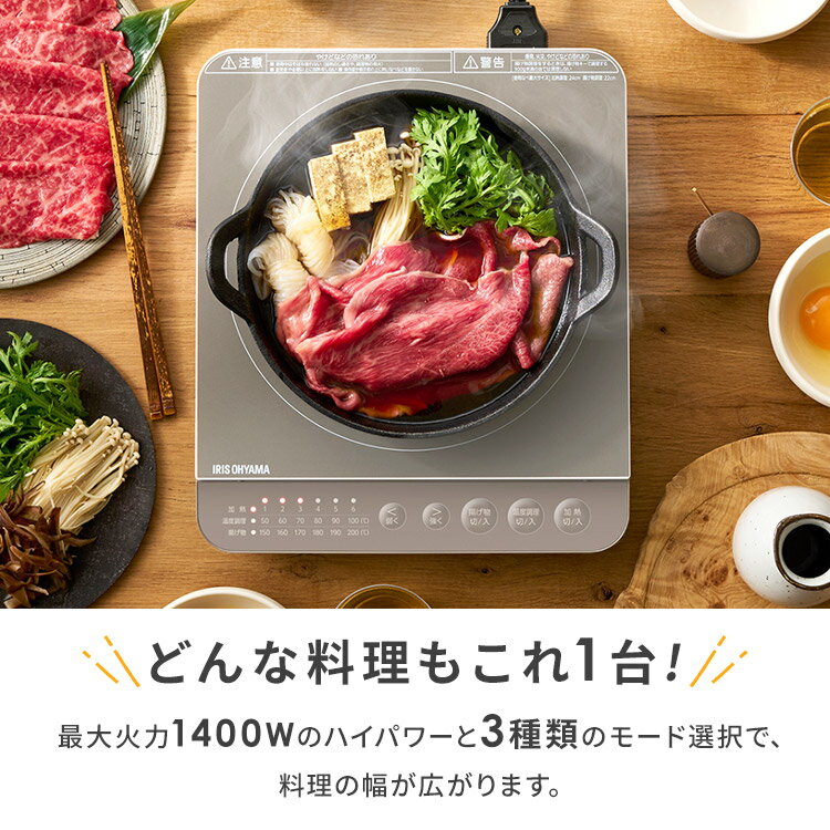 2024年8月29日バリエーション追加しました 卓上で料理の保温から揚げ物まで多用途に使える簡単・便利なIHコンロです。 最大火力1400Wのハイパワーと、3種類のモード(加熱・揚げ物・温度)で、料理の幅が広がります。 低騒音化設計で気になる運転音を抑えて静かに調理ができます。 カセットコンロと使用感は変わらず経済的です。 IHコンロは熱効率が良いから光熱費の削減が出来て経済的です。 掃除がしやすい、ガラストップを採用しています。 吹きこぼれがあってもサッとふき取るだけの簡単お手入れ。 火を使わないので空気を汚さず一酸化炭素中毒の危険がありません。 コードに足や手を引っ掛けてもコードだけ外れるマグネットコードを採用。小さなお子様がいるご家庭でも安心です。 【5つの安全機能】 ・なべ検知機能 ・鍋なし自動OFF ・小物検知機能 ・切り忘れ自動OFF ・温度過上昇防止機能 ●商品サイズ(cm)幅約28×奥行約32.6×高さ約5.4 ●本体重量約2.2kg ●電源 AC100V(50/60Hz) ●定格消費電力 1400W ●電源コード長さ 約1.8m ●ヒーター IHヒーター 1400W ●火力調節 加熱調理:6段階(火力)80W相当〜1400W 揚げ物調理:6段階(油温)約150〜約200℃ 温度調理モード6段階(温度):50℃~100℃ 【使えるなべ】 ・材質 鉄・鉄鋳物、鉄ほうろう、ステンレス、多層鋼なべ※種類によっては発熱しないことがあります。 ・大きさ 加熱調理の場合:直径12〜24cmのもの 揚物調理の場合:直径18〜22cmのもの 温度調理の場合:直径20~24cmのもの ・形状:底の平らなもの 揚げ物調理:反りが1mm以下のもの 加熱調理の場合:反りが3mm以下のもの 温度調理の場合:反りが2mm以下のもの ※特に揚物調理の時は、底に凹凸模様などのない鍋を使用してください。 【使えないなべ】 ・材質 耐熱ガラス、陶磁器・土なべ、アルミ・銅 ・大きさ 直径12cm未満のもの トッププレートの鍋の目安からはみ出すサイズのもの ・形状 中華なべなど底が丸いもの 底に段がありトッププレートに密着しないもの 底に脚があるもの ※IH調理器では、材質や大きさにより使える鍋と使えない鍋があります。 使用する鍋は、財団法人「製品安全協会」のSGマークのあるものをお勧めします。 (検索用:IHコンロ IHクッキングヒーター IH調理 調理 クッキング 電気コンロ 家電 台所 食卓 一人暮らし 安全 料理 加熱 食事 火力 鍋 ブラック 電気 テーブル 卓上 4967576666329 4967576666336 4967576666343) 【鍋24cm】 ●商品サイズ(cm) 幅約33×奥行約27×高さ約9.5 寸法(直径)24cm ●質量(kg) 約1.3 ●表面加工 内側/フッ素樹脂加工 外側/焼付塗装加工 ●材質 本体/アルミニウム合金(底の厚さ2.4mm) はり底/ステンレス鋼(クロム16%)(厚さ0.5mm) ●満水容量 3.4L ※電磁調理器(IHクッキングヒーター)対応 ※まれに一部の電磁調理器(IHクッキングヒーター)で使えない場合があります。 ※ガスコンロでもお使いいただけます。 【平面プレート】 ●商品サイズ(cm) 幅約34×奥行約28×高さ約8.3 ●質量 約1.7kg ●表面加工 セラミックコーティング(内側)、焼付塗装加工(外側) ●材料の種類 アルミニウム合金(本体)、ステンレス鋼(クロム16%)(貼り底) ●底の厚さ 6.5mm(貼り底を含む) ※火力を「中」以下にしてご使用ください。 ※ガス火・電子レンジの使用はできません。 【焼肉プレート】 ●商品サイズ(cm) 幅約34×奥行約28×高さ約3.4 ●質量 約1.33kg ●表面加工 セラミックコーティング(内側) 焼付塗装加工(外側) ●材料の種類 アルミニウム合金(本体) ステンレス鋼_クロム16%(貼り底) ●底の厚さ 6.5mm(貼り底を含む) ※火力を「中」以下にしてご使用ください。 ※ガス火・電子レンジの使用はできません。 2023年9月5日リニューアルしました 型番 IHK-T37 → IHK-T391 温度調理モードが追加! カラー:ホワイト削除しました 最強翌日配送対象商品に関するご案内 最強翌日配送対象商品・対象地域に該当する場合は最強翌日配送マークがご注文カゴ近くに表示されます。 最強翌日配送可能なお支払方法は【クレジットカード、代金引換、全額ポイント支払い】のみとなります。 下記の場合は最強翌日配送対象外となります。 ・15点以上ご購入いただいた場合 ・時間指定がある場合 ・ご注文時備考欄にご記入がある場合 ・決済処理にお時間を頂戴する場合 ・郵便番号や住所に誤りがある場合 ・最強翌日配送対象外の商品とご一緒にご注文いただいた場合 ・お届け先住所文字数が40文字以上の場合