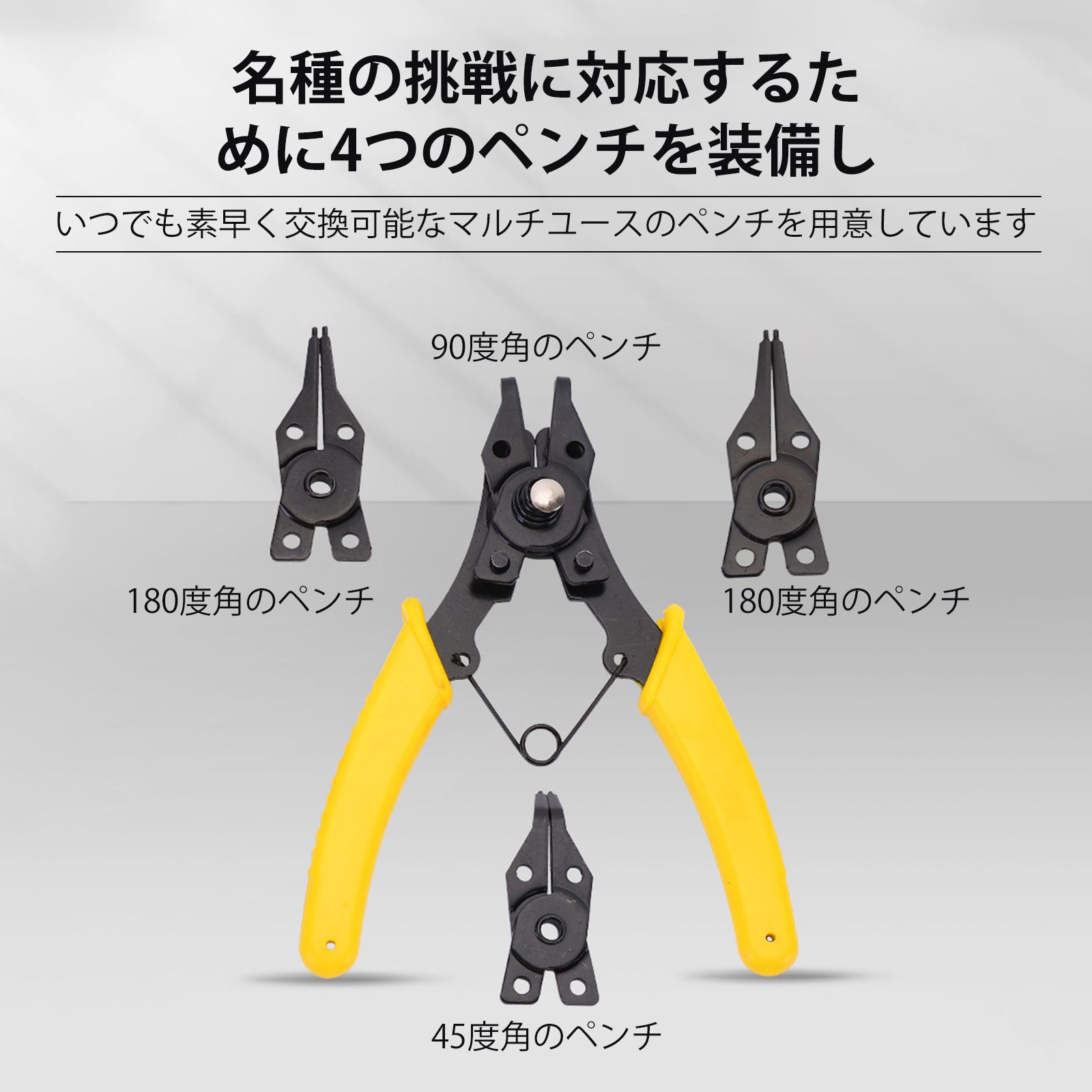 スナップリングプライヤー 工具 セット 多機能 4in1 高炭素鋼鍛造 180度.90度.45度 3種類の交換用ヘッド 6通りの使い方 軸用 穴用 兼用ヘッド付き プライヤー 工具 スプリットリング プライヤー カプラー外し工具 快適ハンドル付き
