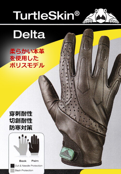 タートルスキンの最新作。しなやかなレザーを使用したデルタグローブ ポイント切創・穿刺耐性に加え防寒対策にも! ポイントアウターにはしなやかなレザーを使用しファッション性と操作性を兼ね備えた商品 ポイント切創耐性:18.8N 穿刺耐性:21G注射針/約12.6N ポイントサイズはXS〜XXLまで 多目的に使えるデルタグローブ。防寒・モータースポーツ・アウトドア etc… 手の甲と親指以外の指先には特許を取得した最新のタートルスキン100%を使用し、切創・穿刺耐性を持たせています。 それ以外の手の甲から手首、指周りにはケブラーを使用し、切創耐性を持たせています。 これらは麻薬中毒者の多くが使用する28ゲージの皮下注射針(主にインスリン用)に対しても高い防護性を備えています。 (イラストの防護エリア参照) さらに、アウターにやわらかいレザーを使用するなど、デザイン性にも優れているため普段使いにもおすすめです。 XS S M L XL XXL 手の周囲(cm) 19 20 21 22 24 25 手の長さ(cm) 19 20 21 22 23 24 素材 インナー:タートルスキン・ケブラー アウター:レザー 洗濯方法 中性洗剤で手洗いをし、平らな場所で形を整えて陰干しをしてください。乾燥機や漂白剤は使用しないでください。 (注) 切創・穿刺耐性グローブは手の安全をを保証するものではありません。 繊維を引っ張った状態での使用は切れやすく、またアイスピック等の鋭利なものも 規格以上の力が加わった場合や、何度も繰り返し突刺した場合は貫通します。 アウター素材に切創耐性はありません。 ※絶対に切れない、貫通しない素材は存在しません。 関連キーワード 防刃グローブ 突刺し 切創 タートルスキン