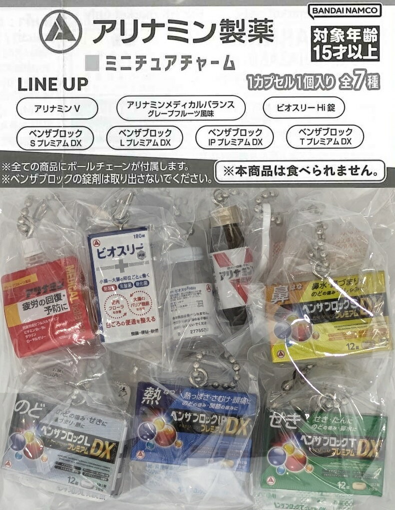 バンダイ アリナミン製薬 ミニチュアチャーム 【各種】 新古品・未開封品 アリナミン製薬株式会社の製品がミニチュアチャームになって登場! 全種ダブルチャームの豪華仕様! 【セット内容】 『全7種セット』 ・アリナミン V ・アリナミンメディカルバランス グレープフルーツ風味 ・ビオスリー Hi 錠 ・ベンザブロック S プレミアム DX ・ベンザブロック L プレミアム DX ・ベンザブロック IP プレミアム DX ・ベンザブロック T プレミアム DX 『3種セット』 ・アリナミン V ・アリナミンメディカルバランス グレープフルーツ風味 ・ビオスリー Hi 錠