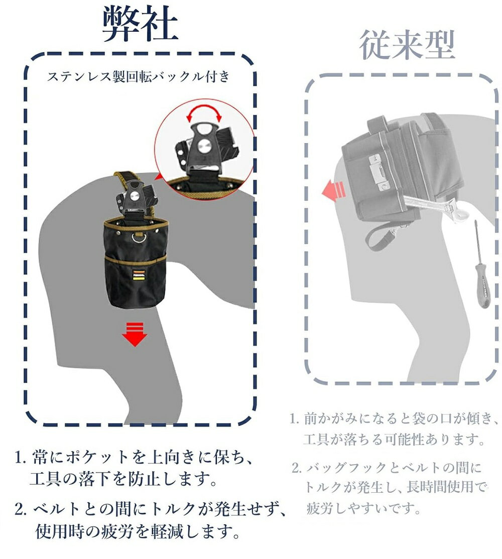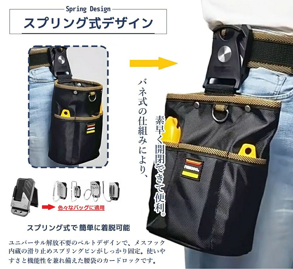 即納★腰袋 釘袋 2段 バネ式開閉 着脱式工具ホルダー付き ベルト装着可能 工具ポーチ 小物入れ 防水・耐久 高密度ナイロン素材 防水 耐久 電工 大工 DIY 釣り用