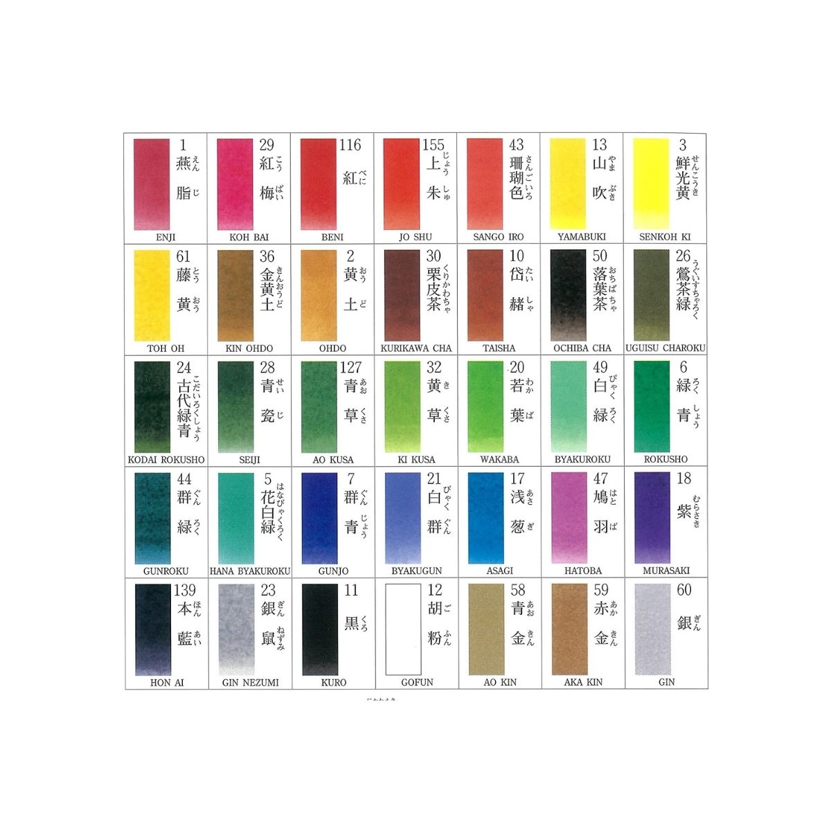 水干絵の具やチューブ絵の具と同じ顔料に、天然高級デンプン質と膠分を加え練り混ぜ、角皿に入れて乾燥させたものを顔彩と言います。 色調は透明型淡彩色で、日本画、絵手紙などに適しています。 配色:燕脂、紅梅、紅、上朱、珊瑚、山吹、鮮光黄、藤黄、金黄土、黄土、栗皮茶、岱赭、落葉茶、鶯茶緑、古代緑青、青瓷、 青草、黄草、若葉、白緑、緑青、群緑、花白緑、群青、白群、浅葱、鳩羽、紫、本藍、銀鼠、黒、胡粉、青金、赤金、銀(35色) 箱サイズ 25.5cm×21cm ※顔彩は性質上、温度・湿度に反応して、表面にひび割れが起きやすくなっております。 品質には問題ございませんので、そのままお使い下さい。 ひび割れによる返品・交換はお受けできませんので、あらかじめご了承くださいませ。【商品情報】 ※写真の色調はご使用のモニターの機種や設定により、実際の商品と異なる場合があります。