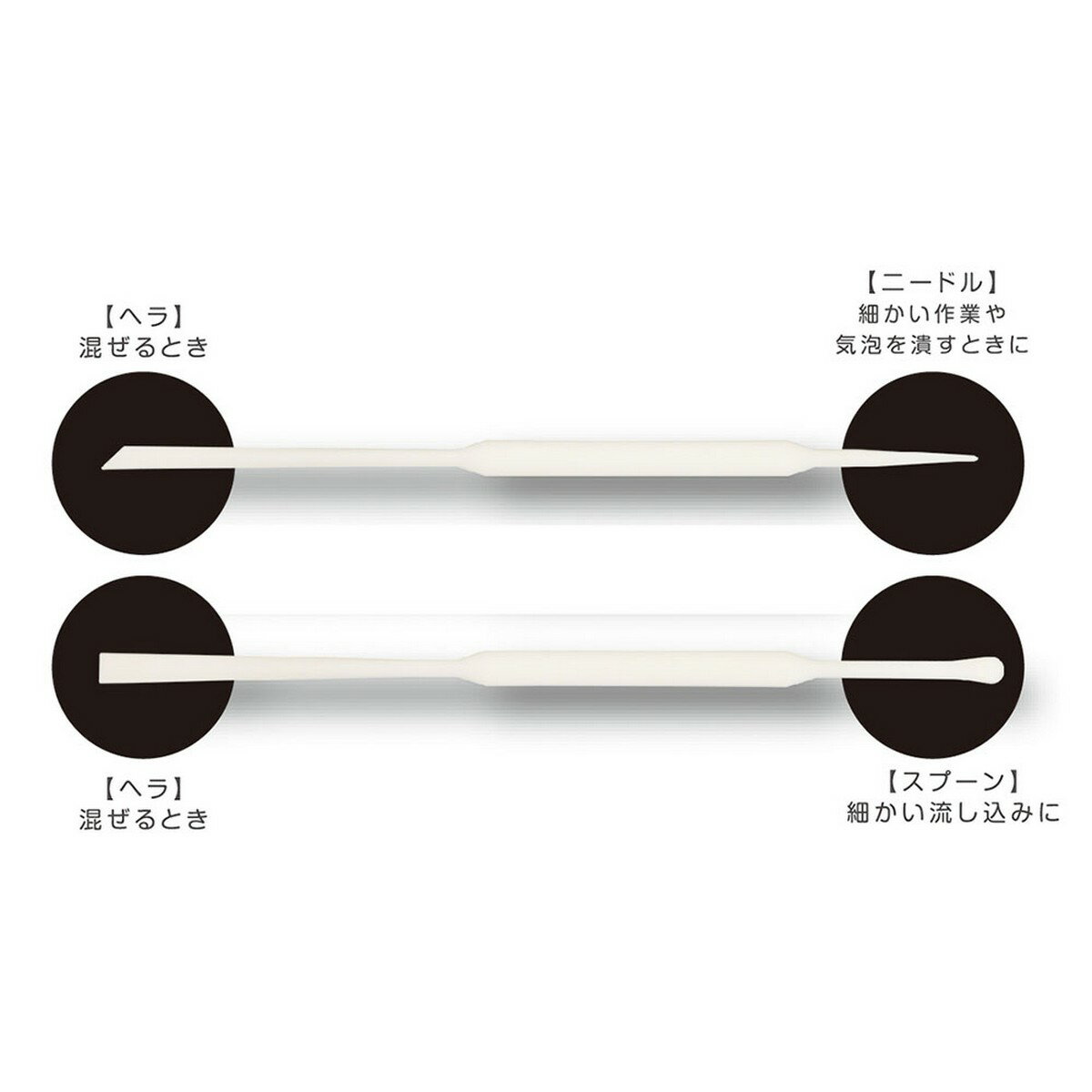 【特徴】 ●透明樹脂(UVレジン・2液性レジン)など、調色時の攪拌に使用できる混ぜ棒。 ●スプーンで着色剤などの取り出し、ピックで気泡取りや細かなモールドへの流し込みなど、様々な用途に使用できます。 ● 混ぜやすさと硬さ、強度、軽さを調整した素材。 ● ヘラとスプーン、ヘラとニードルの両方使いが可能。 ● スティックをテーブルに置いても先端が浮くので、レジンがついていてもテーブルが汚れにくい。【商品情報】 ※写真の色調はご使用のモニターの機種や設定により、実際の商品と異なる場合があります。