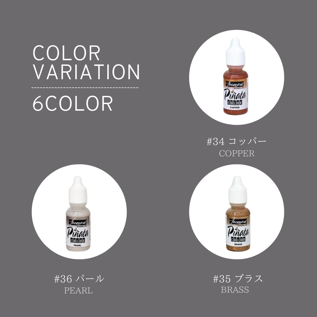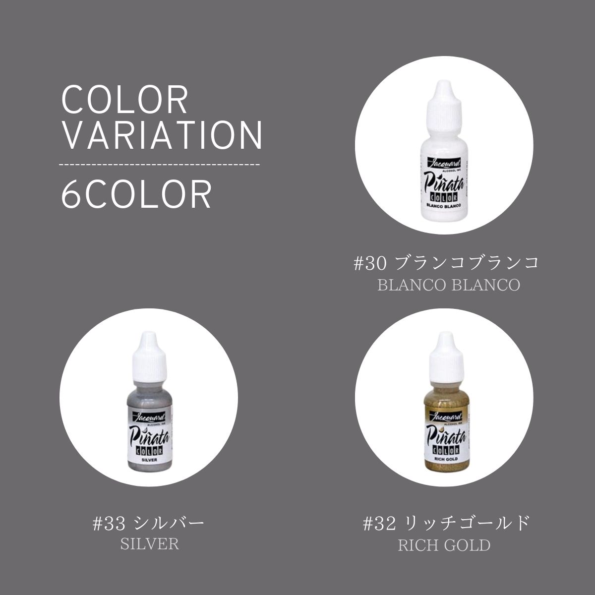 容量:1/2oz(14g) 販売色:#030 ブランコ(ホワイト)#032 リッチゴールド/#033 シルバー/#034 コッパー/#035 ブラス/#036 パール/ 繊細で深みのあるメタリックカラーなのでどんな作品の表現にもアクセントとして最適です。 【ジャガードピニャータカラーとは】 アメリカ カリフォルニア州に本社を置くアルコールメーカーJacquard社(ジャガード社)のアルコールインク"ピニャータカラー"シリーズ。 特にメタリックカラーの質の良さに定評があり、インクアートで広く使用されています。 酸を含まないインクの為、酸化による劣化が少なくアートを美しく保ちます。【商品情報】 ※お使いのモニターの発色具合によって、実際のものと色が異なる場合がございます。