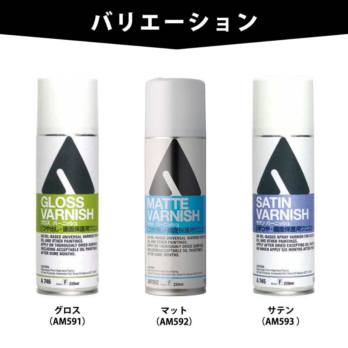 スプレー式 保護ワニス 耐水性、耐光性に優れた丈夫で変色のない塗膜をつくります。 再溶解性なので、ペトロールやテレビンで除去した後、塗り替えることができます。 【グロス】AM591 〈つや出し 画面保護用ワニス〉 【マット】AM592 〈つや消し 画面保護用ワニス〉 【サテン】AM593 〈半つや 画面保護用ワニス〉【商品情報】 注意事項:お使いのモニターの発色具合によって、実際のものと色が異なる場合がございます。